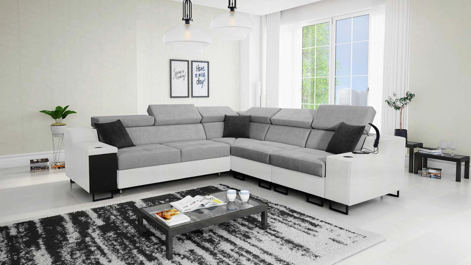 Ecksofa Alcamo III in Grau/Weiß mit verstellbaren Kopfstützen ist ein elegantes Möbelstück, das sich in jede Einrichtung einfügt.