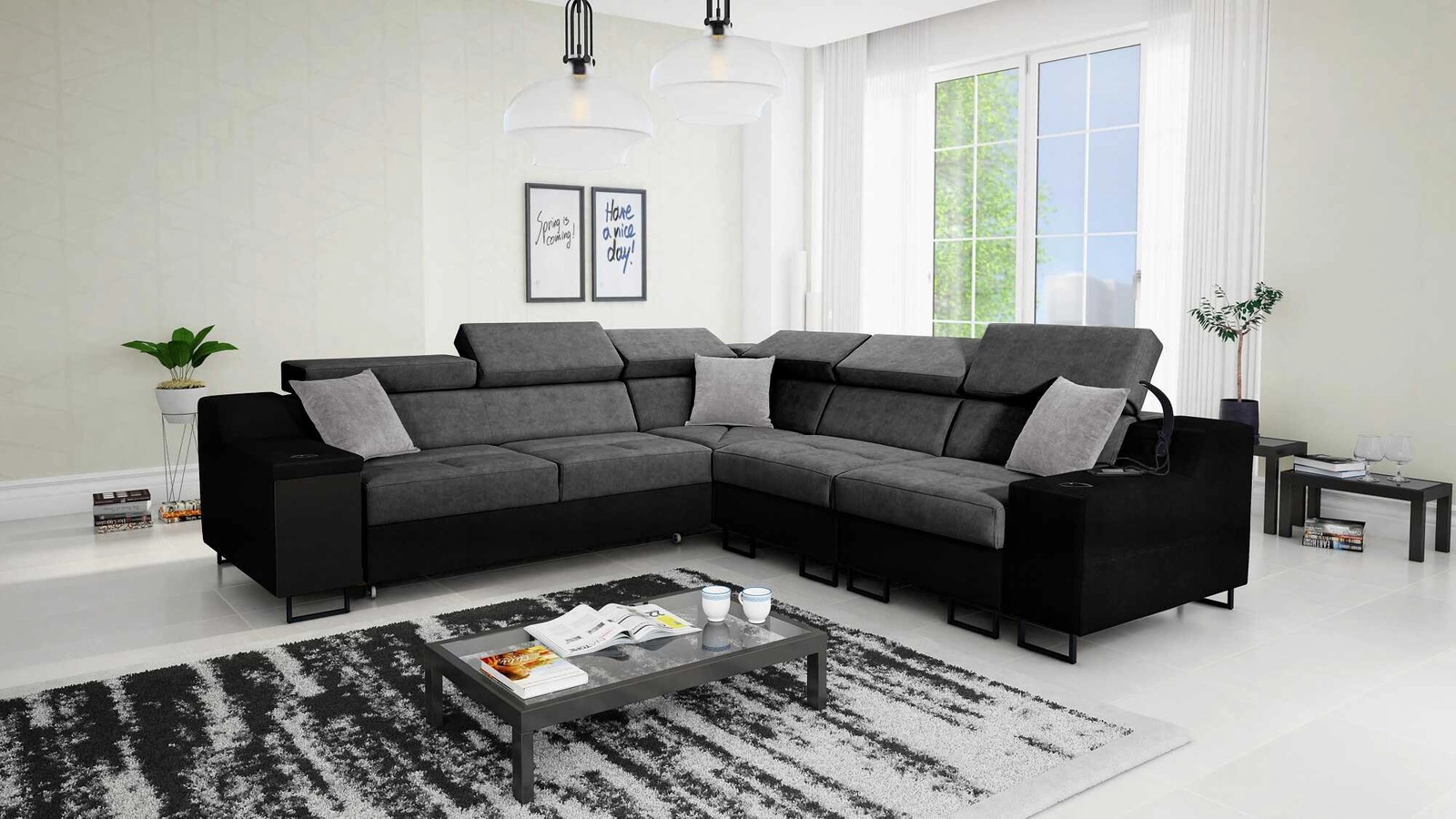 Ecksofa Alcamo III in grau/schwarz mit verstellbaren Kopfstützen ist ein elegantes Möbelstück, das sich in jede Einrichtung einfügt.