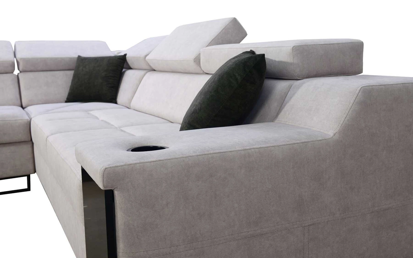 Die Abmessungen der Möbel ermöglichen füllung eines geräumigen Wohnzimmers oder Sitzungssaals. Breite der Ecke 287 cm, maximale Höhe 100 cm und Tiefe 289 cm. Die Liegefläche der Eckeinheit beträgt 127x210 cm. Die Sitzhöhe des Möbels beträgt 45 cm und die maximale Höhe der Rückenlehne beträgt 60 cm. Gewellte Federn und T30-Polyurethanschaum ist das Material, aus dem der Sitz der Ecke hergestellt ist. Feste Rückenlehne mit verstellbaren Kopfstützen ermöglicht eine einfache anpassung sie können die Neigung der Kopfstützen nach Ihren Wünschen einstellen und so für eine bequeme Erholung nach einem langen Tag sorgen, die Sie, Ihre Lieben und auch Ihre Gäste, die auf diesem einzigartigen Ecksofa Platz nehmen, zu schätzen wissen werden.