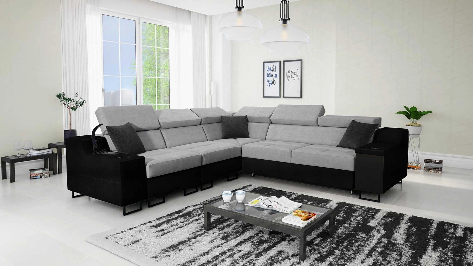 Ecksofa Alcamo III in grau/schwarz mit verstellbaren Kopfstützen ist ein elegantes Möbelstück, das sich in jede Einrichtung einfügt.
