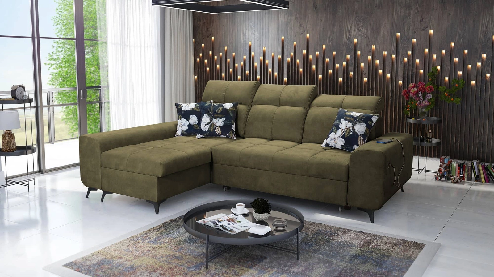 Ecksofa Buffalo in olivgrün mit verstellbaren Kopfstützen ist ein interessant aussehendes Möbelstück mit einer eleganten Ausführung.