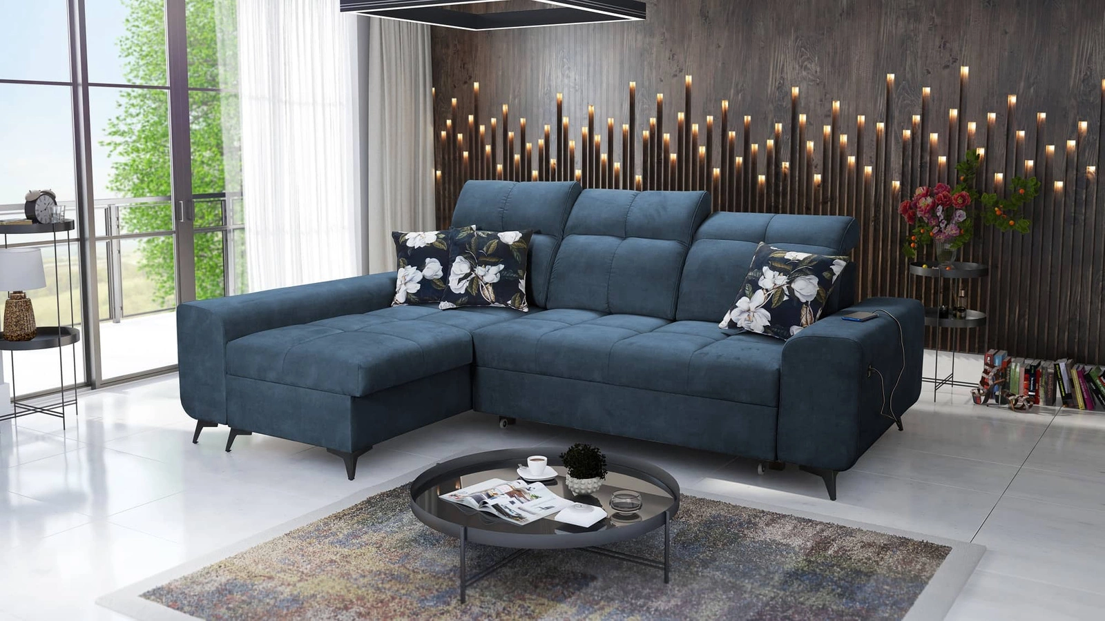 Ecksofa Buffalo in blau mit verstellbaren Kopfstützen ist ein interessant aussehendes Möbelstück mit einer eleganten Ausführung.