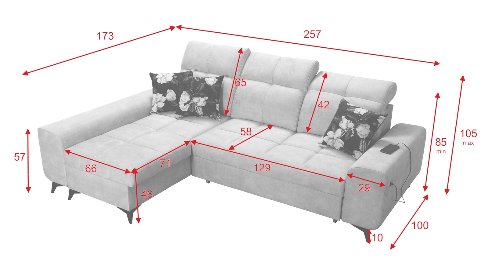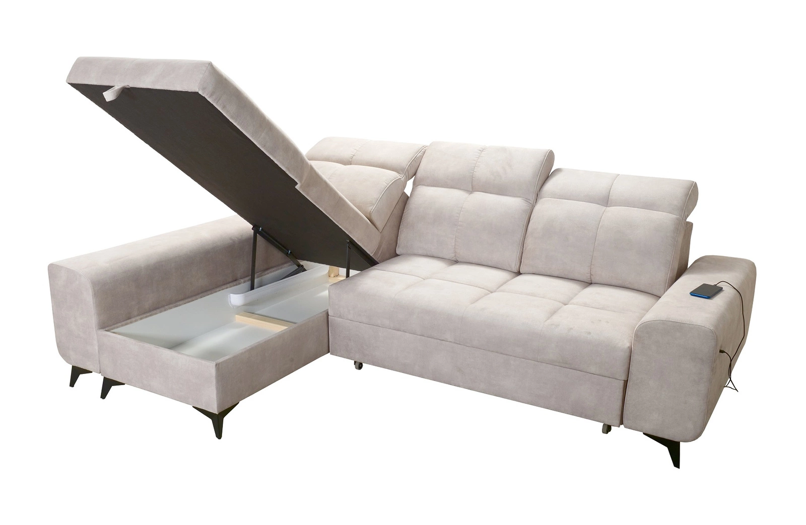 Die Extras dieses Möbelstücks, die alle Nutzer schätzen werden, sind der Bettzeugbehälter, die verstellbaren Kopfstützen und die USB-Ladebuchse an der Seite des Eckmöbels.