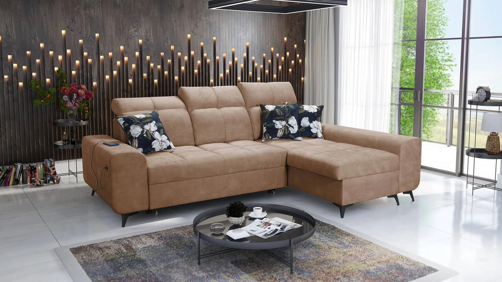 Die Extras dieses Möbelstücks, die alle Nutzer schätzen werden, sind der Bettzeugbehälter, die verstellbaren Kopfstützen und die USB-Ladebuchse an der Seite des Eckmöbels.