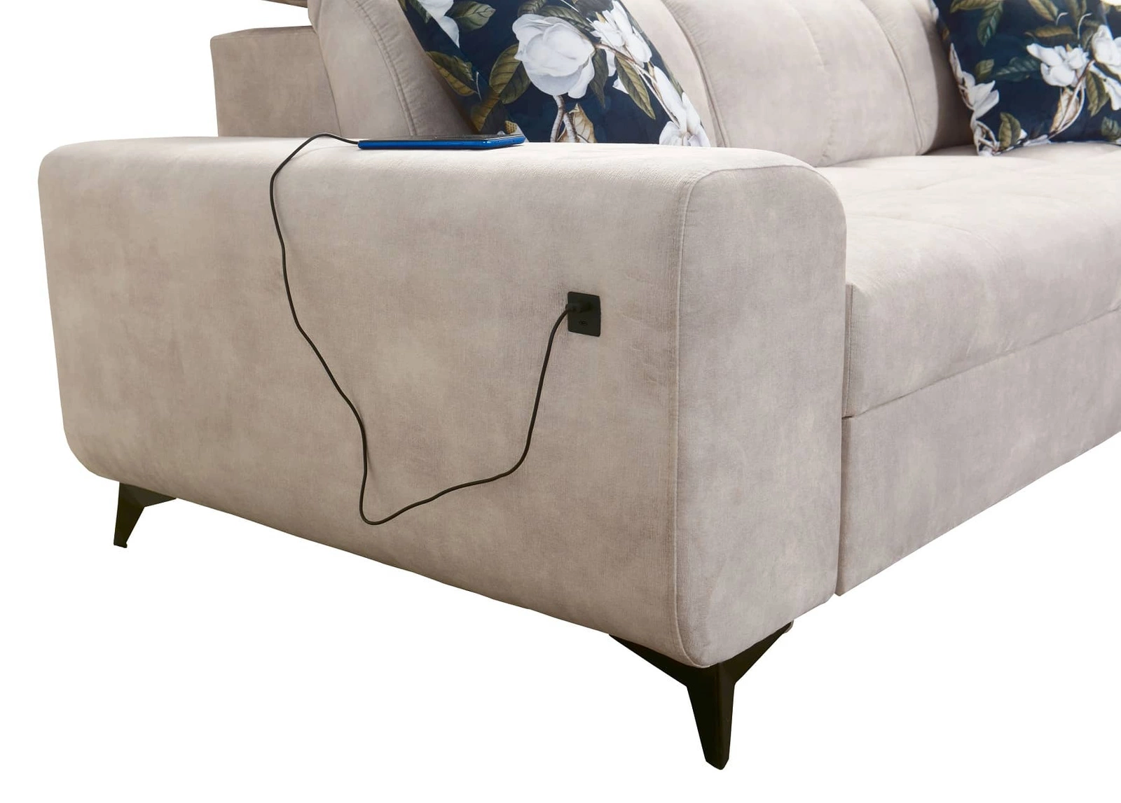 Die Extras dieses Möbelstücks, die alle Nutzer schätzen werden, sind der Bettzeugbehälter, die verstellbaren Kopfstützen und die USB-Ladebuchse an der Seite des Eckmöbels.