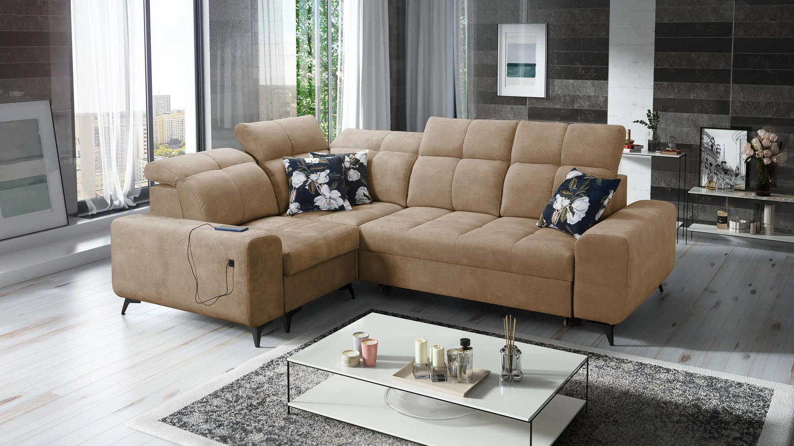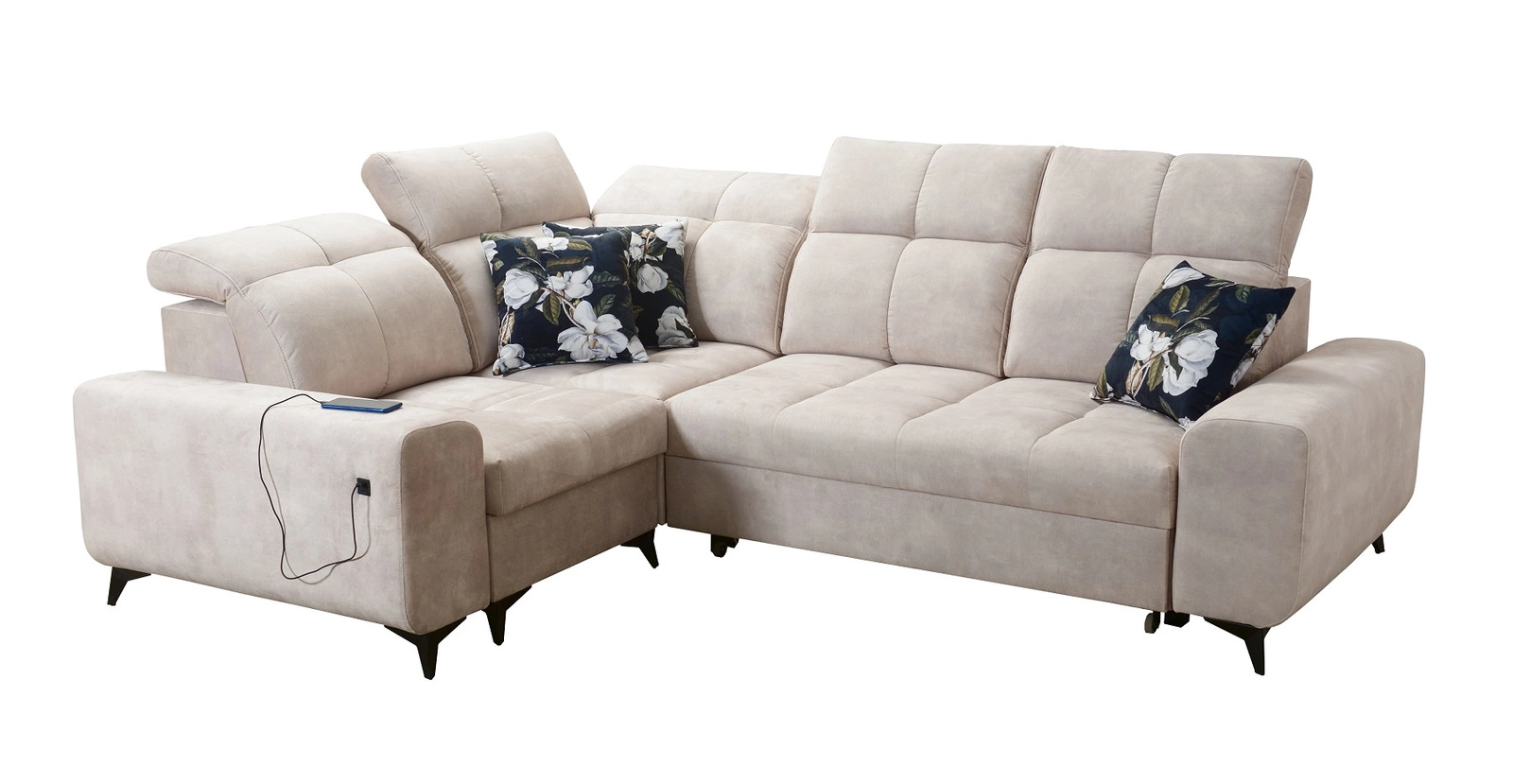 Die Extras dieses Möbelstücks, die alle Nutzer schätzen werden, sind der Bettzeugbehälter, die verstellbaren Kopfstützen und die USB-Ladebuchse an der Seite des Eckmöbels.