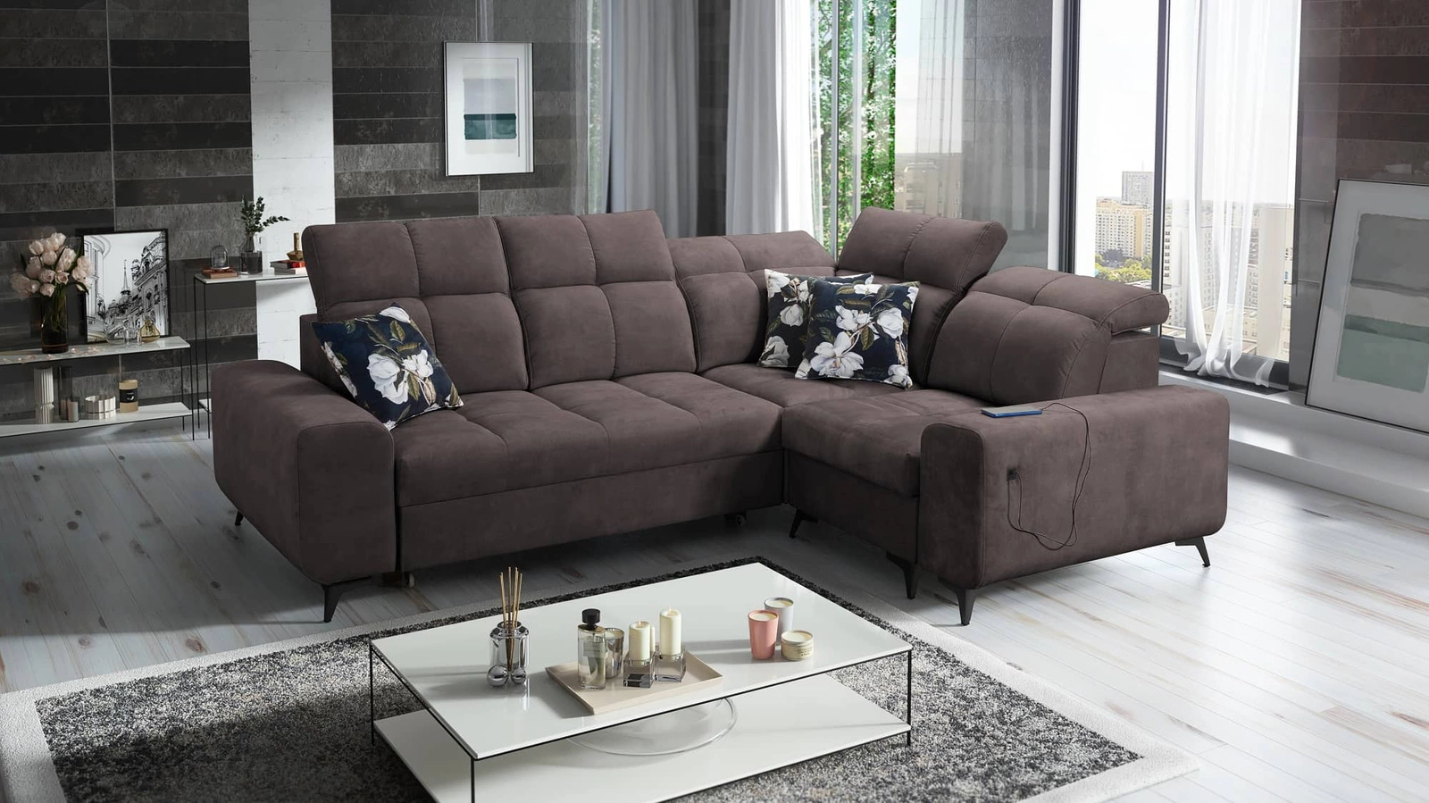 Die Extras dieses Möbelstücks, die alle Nutzer schätzen werden, sind der Bettzeugbehälter, die verstellbaren Kopfstützen und die USB-Ladebuchse an der Seite des Eckmöbels.