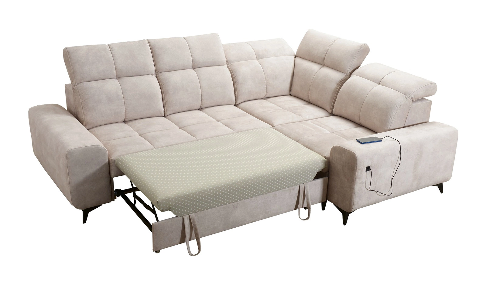 Die Extras dieses Möbelstücks, die alle Nutzer schätzen werden, sind der Bettzeugbehälter, die verstellbaren Kopfstützen und die USB-Ladebuchse an der Seite des Eckmöbels.