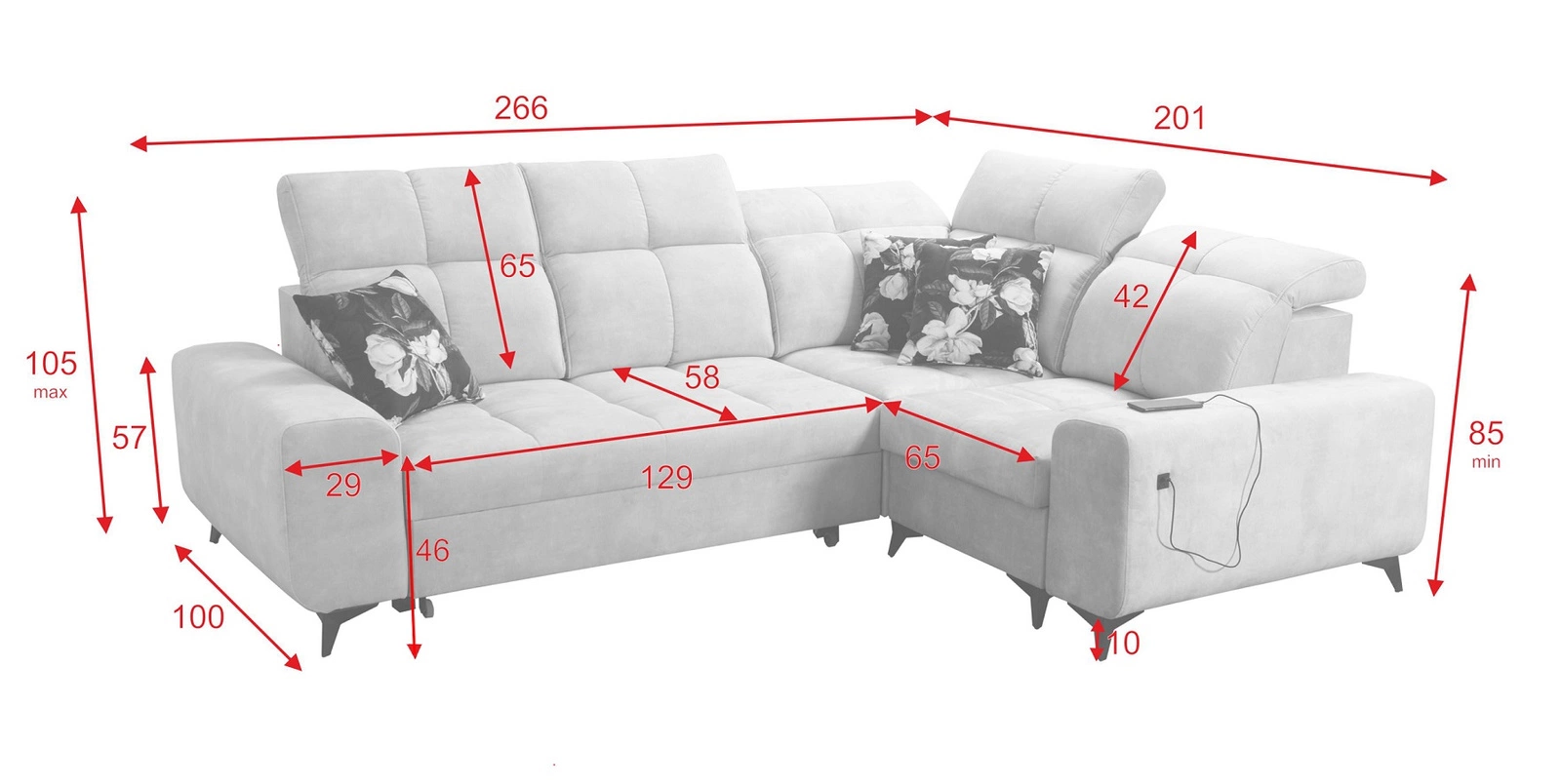 Die Extras dieses Möbels, die alle Benutzer schätzen werden, sind der Bettzeugbehälter, die verstellbaren Kopfstützen und die USB-Ladebuchse an der Seite des Eckmöbels.