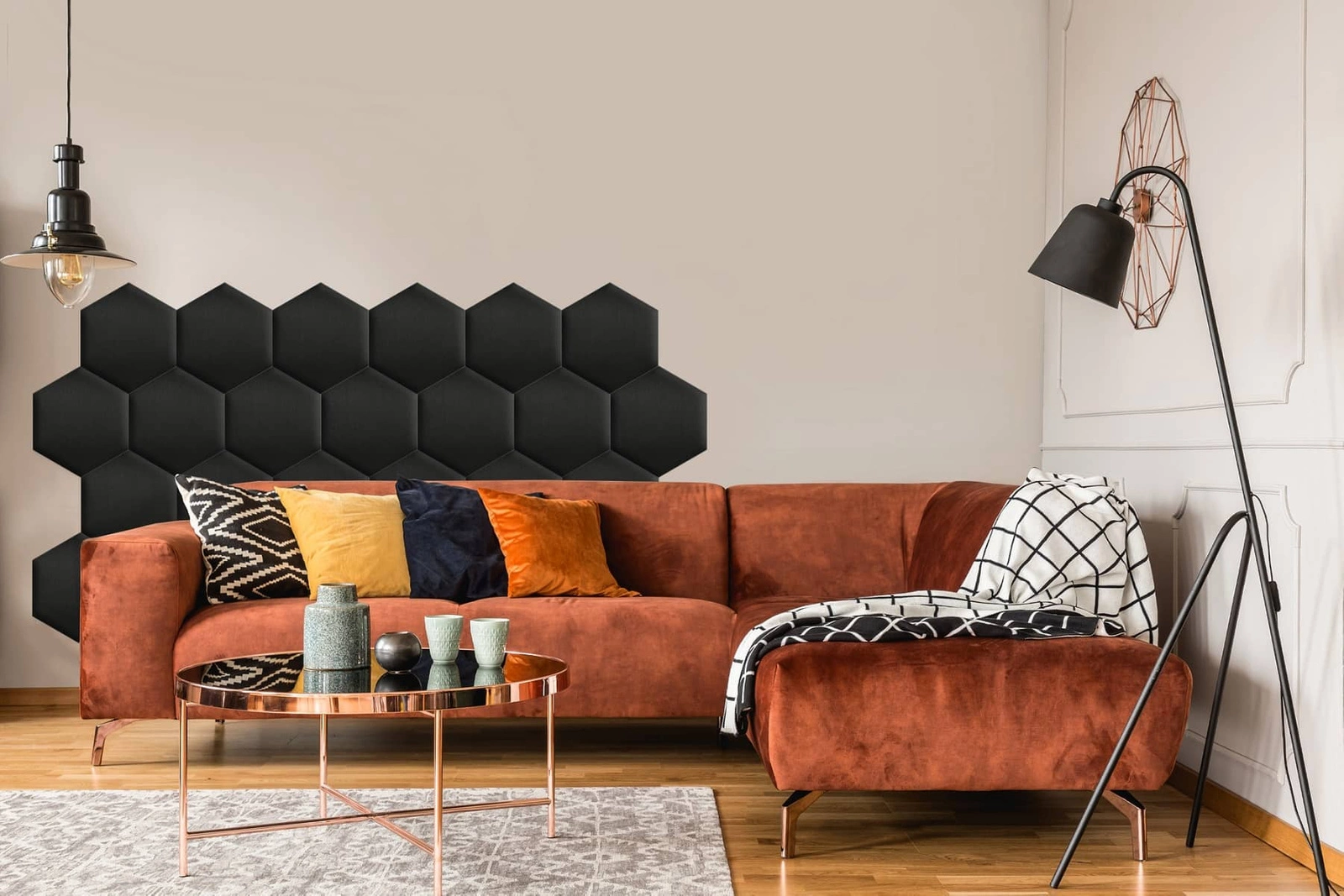 Gepolstertes Paneel Heksagon in Schwarz ist eine Dekoration, die Liebhaber moderner Arrangements begeistern wird.