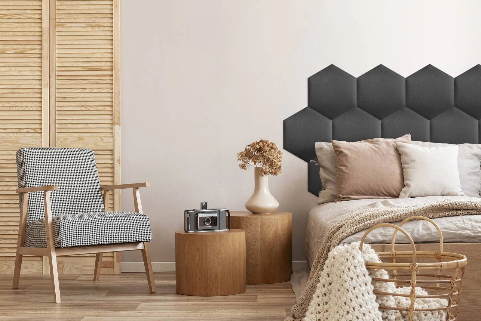 Gepolstertes Paneel Heksagon in der Farbe Graphit ist eine Dekoration, die Liebhaber moderner Arrangements begeistern wird.