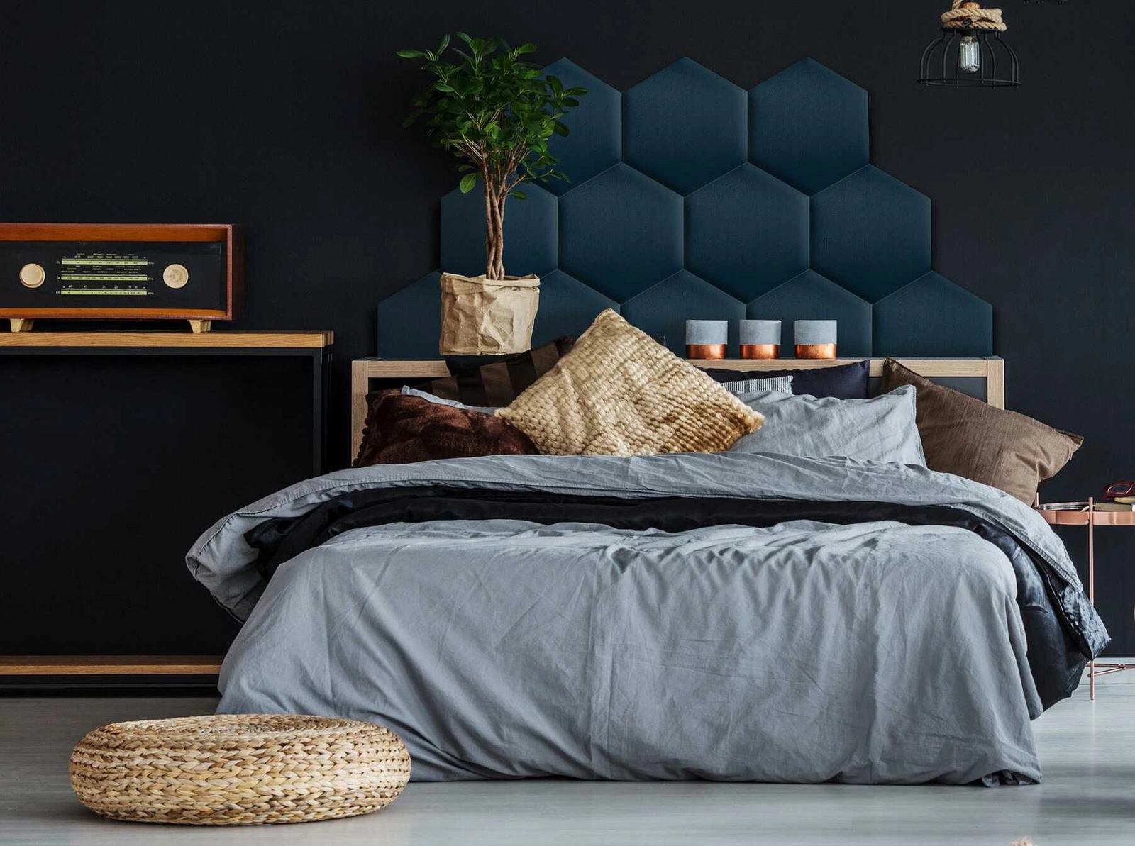Gepolstertes Paneel Heksagon in navy blau ist ein Dekorationsvorschlag, der die Liebhaber moderner Arrangements begeistern wird.