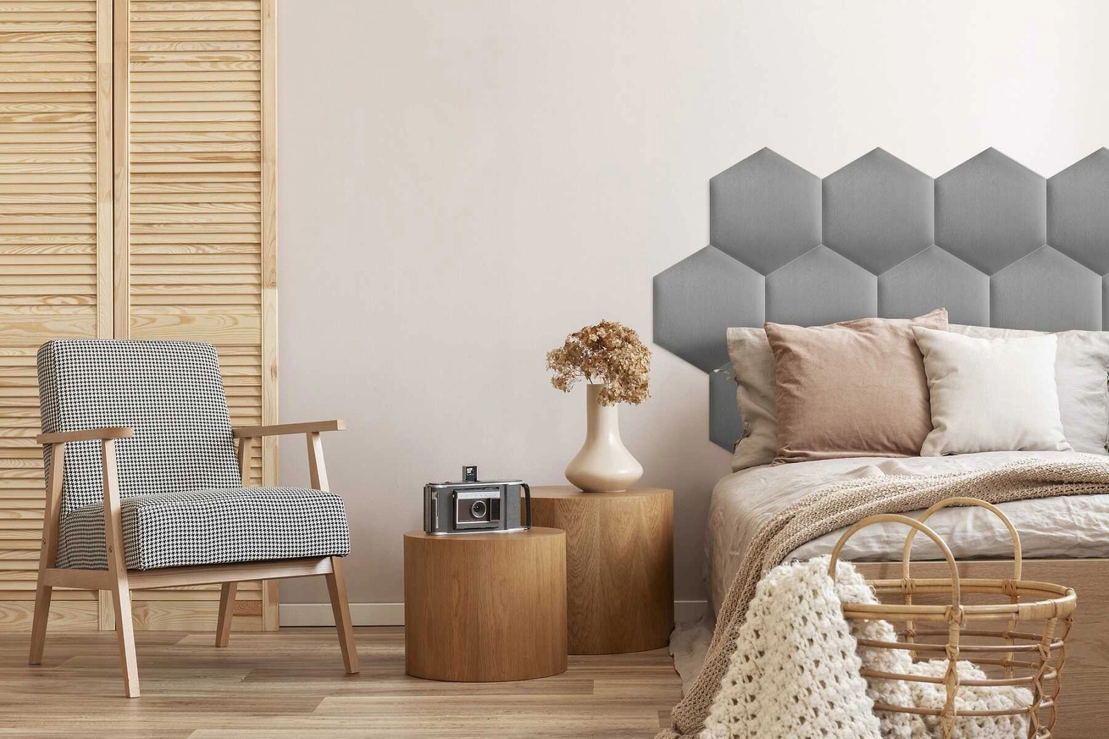 Gepolstertes Paneel Heksagon in Hellgrau ist eine Dekoration, die Liebhabern von modernen Arrangements gefallen wird.