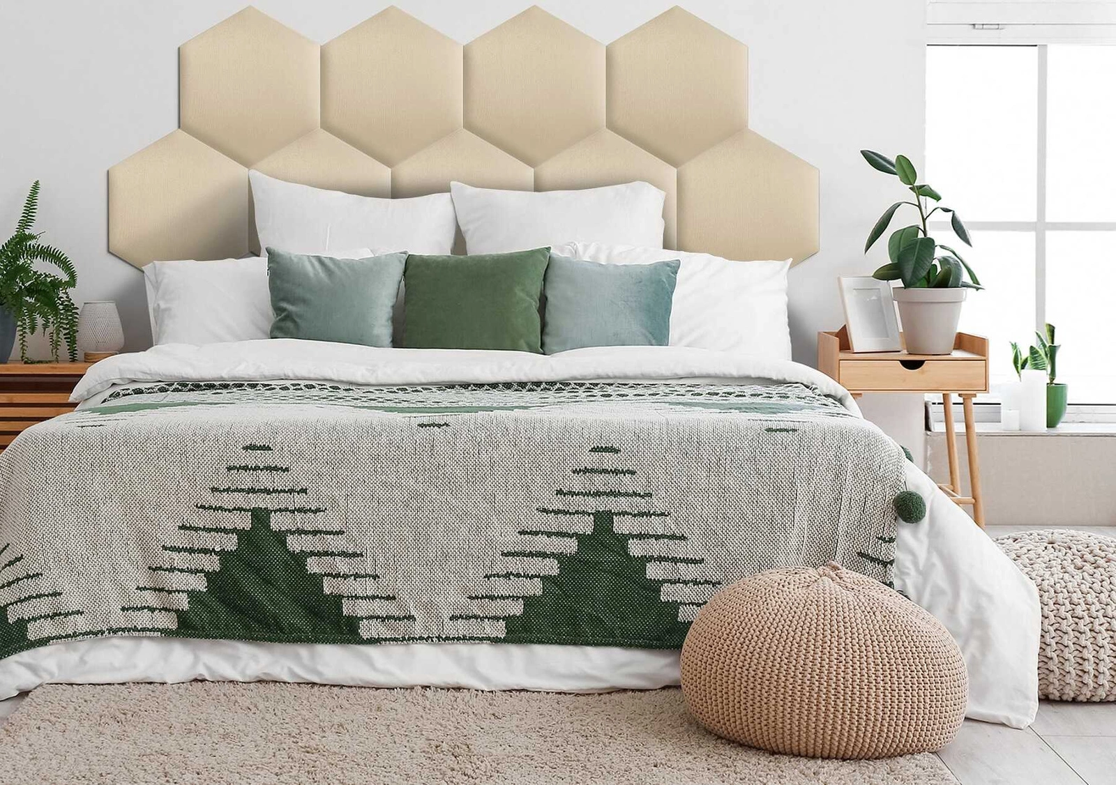 Gepolstertes Paneel Heksagon in Cremefarbe ist eine Dekoration, die Liebhaber moderner Arrangements begeistern wird.