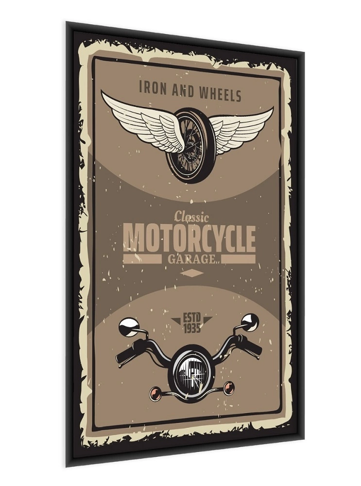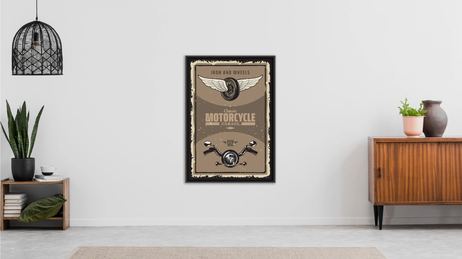 70x100 gerahmtes Poster mit Vintage-Motorrad-Motiv ist ein Vorschlag für eine stilvolle Dekoration, die Liebhaber von modernen Arrangements begeistern wird.