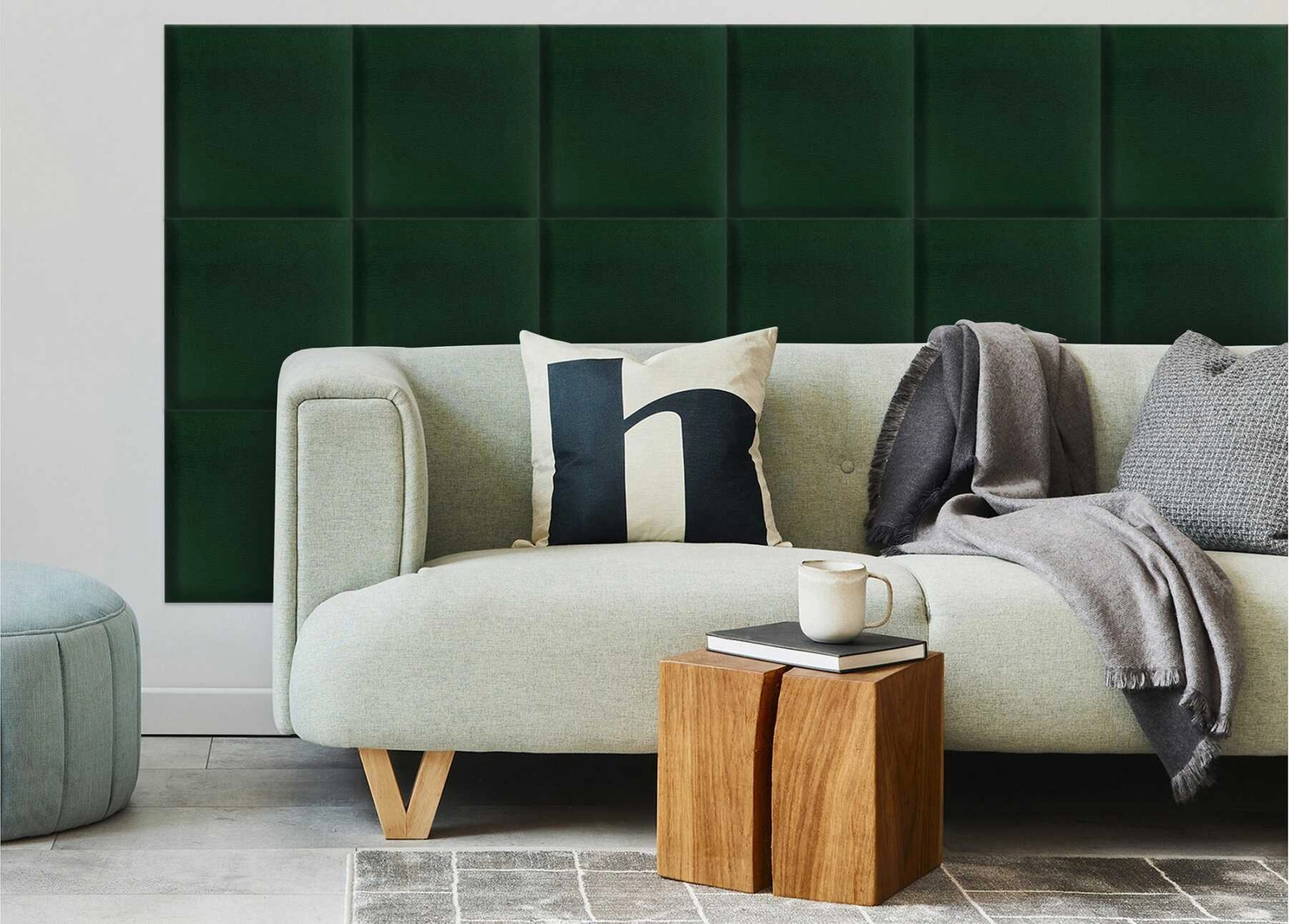 Gepolstertes Paneel Quadra 50x50 cm Flasche grün stilvolles Wandpaneel quadratischer Veloursstoff modisches Finish für jede Einrichtung