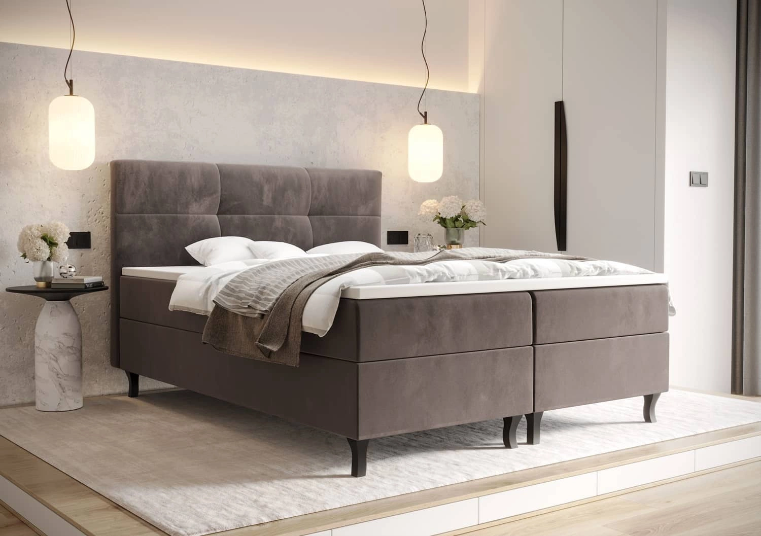 Bett aus Stoff typ samt Monolith 15 garantiert ein Höchstmaß an Komfort und Funktionalität für die tägliche Entspannung im Schlafzimmer. Der Stoff hat eine Beschichtung aus hydrophob, was eine begrenzte Flüssigkeitsaufnahme gewährleistet. Die interessante Struktur des Gewebes verleiht einen einzigartigen Charakter. Dank der Eigenschaften des verwendeten Stoffes behält das kontinentale Bett lange Zeit sein ursprüngliches Aussehen. Das Design des Bettes bietet große Stabilität und Komfort bei der Benutzung. Der Rahmen des kontinentalen Bettes ist aus Holz und einer Möbelplatte gefertigt. Leicht nähen am Kopfteil sind ein Blickfang und verleihen dem Bett einen besonderen Charakter. Das Bett ist ausgestattet mit holzbeine.