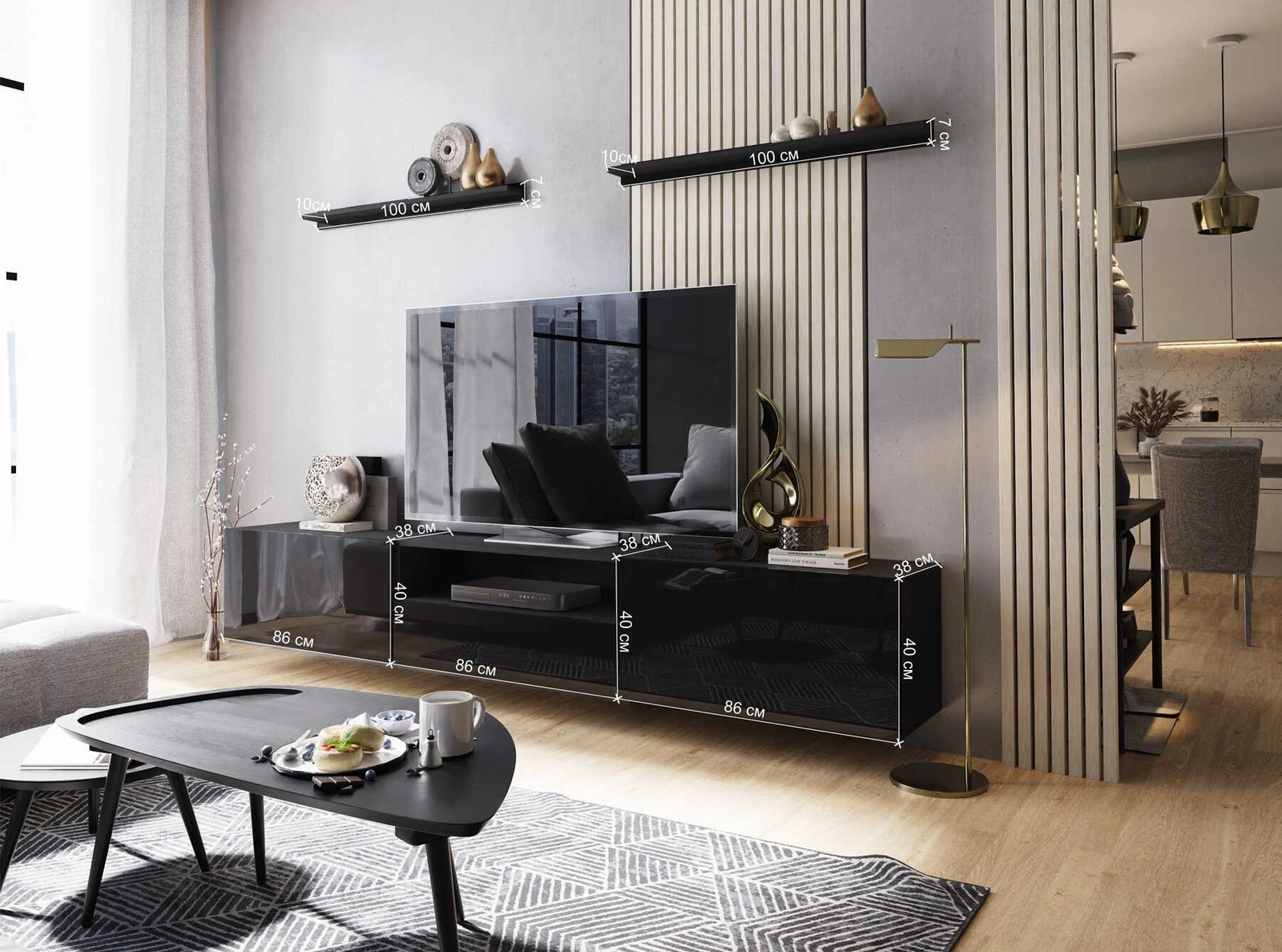 Zusätzliche vorteil von des RTV-Schrankes ist die Möglichkeit, die Positionierung des Schrankes zu wählen. RTV-Schrank kann an die Wand gehängt werden. Dank der Möglichkeit des den Kauf von zusätzlichen Füßen der RTV-Schrank kann sehr schnell ein stehendes Möbelstück werden. Hängende Regale ermöglichen es Ihnen, Ihre Wohnaccessoires dezent zu präsentieren.