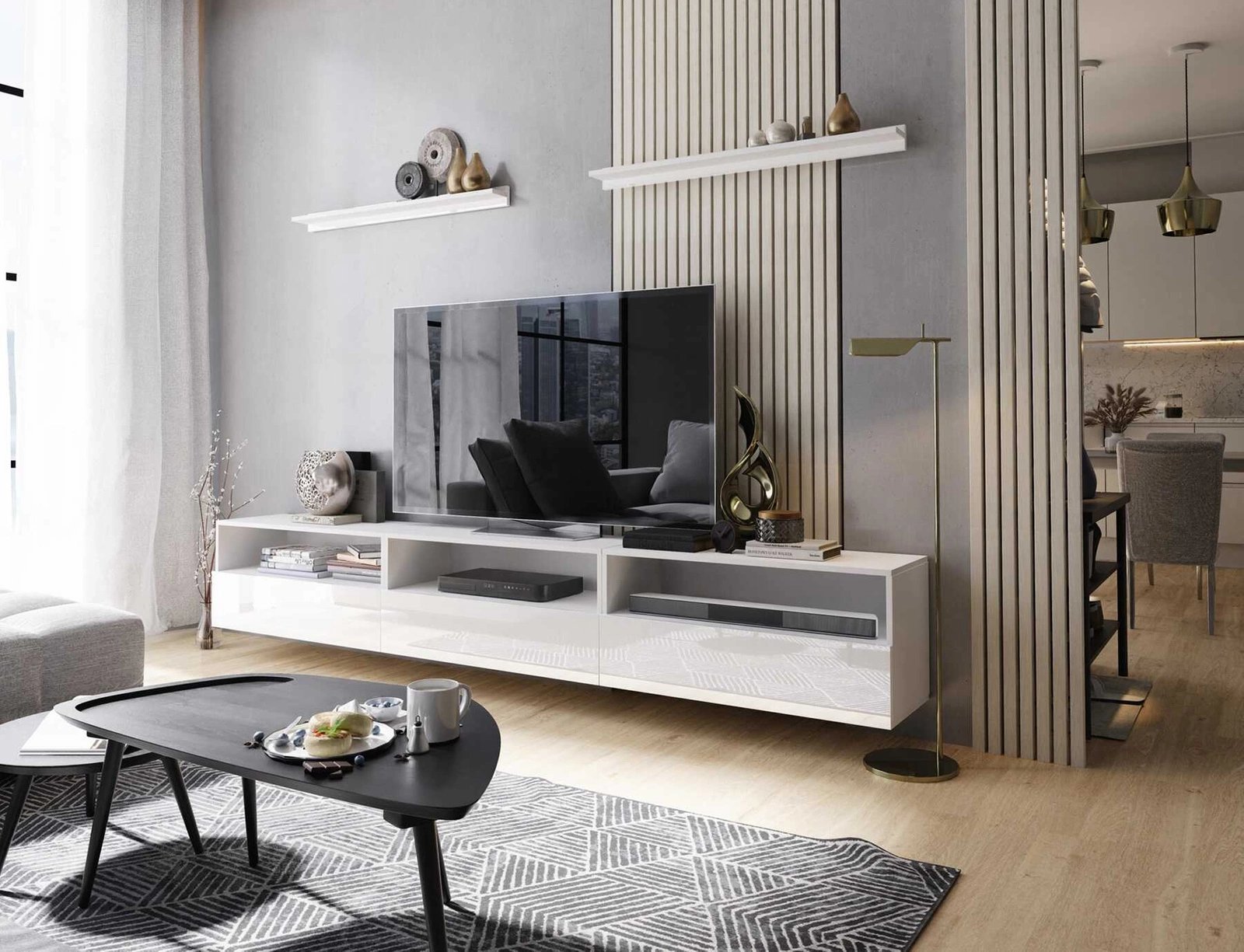 Der Kaires RTV-Wandschrank in Weiß ist ein modernes Design-Möbelstück, das Ihre Einrichtung stilvoll vervollständigen wird.
