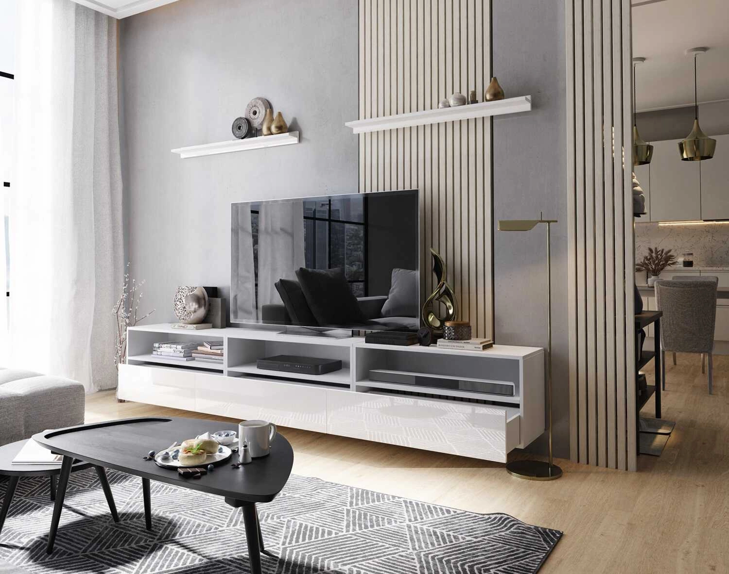 Biała szafka RTV Kaires Szafka RTV do salonu wykończona na wysoki połysk