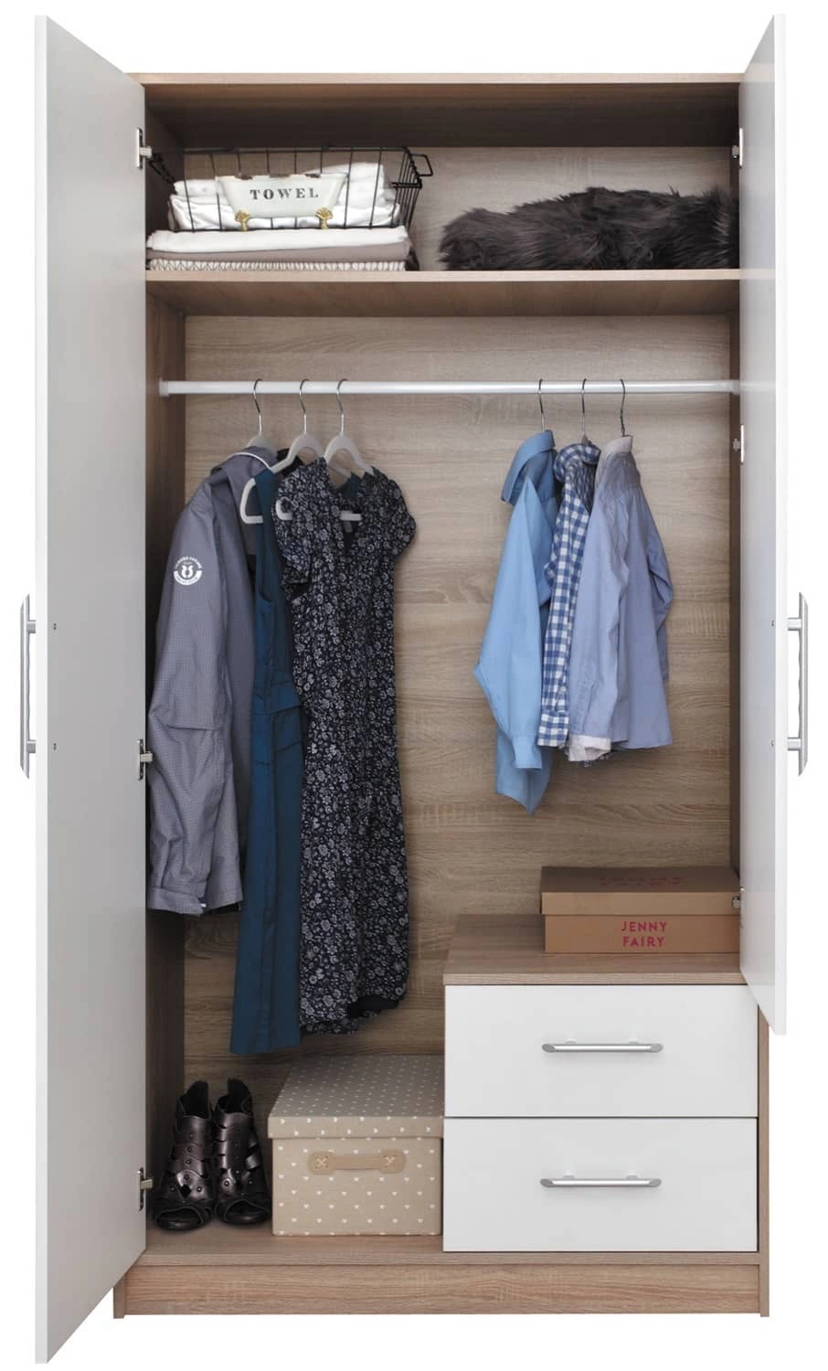 Der Kleiderschrank ist aus hochwertigem laminierter Platte, die gekennzeichnet ist durch hohe widerstand gegen äußere Einflüsse wie Prellungen, Stöße und unglückliche Kratzer. Der Kleiderschrank ist unterteilt in einen Bereich mit einer Bar i teil mit Regalen. Der Auszug der Schubladen erfolgt über zuverlässige Rollenführungen. Caspe ist perfekt als Kleiderschrank für das Schlafzimmer oder als Garderobe für den Flur.