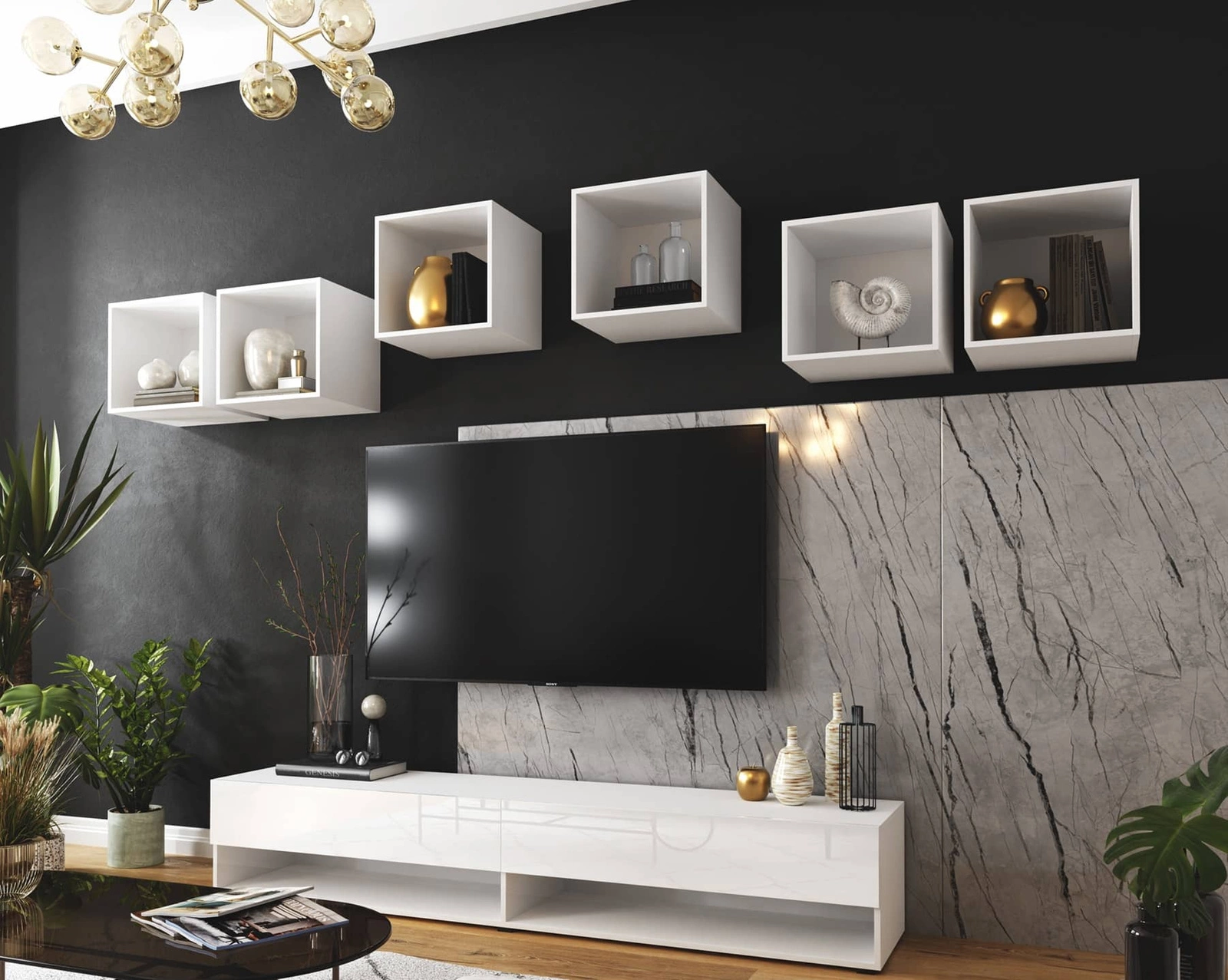 Die weiße Schrankwand Lindos ist eine Garantie für modernes Design, das Ihre Einrichtung stilvoll vervollständigen wird.