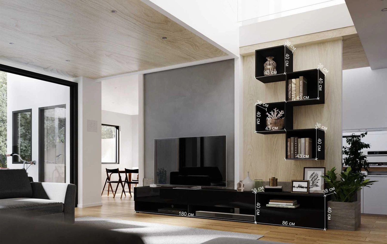Die Wohnwand Nemea besteht aus sechs Elementen, die beliebig angeordnet werden können, so dass Sie die Anordnung des Sets an Ihre Bedürfnisse anpassen können.