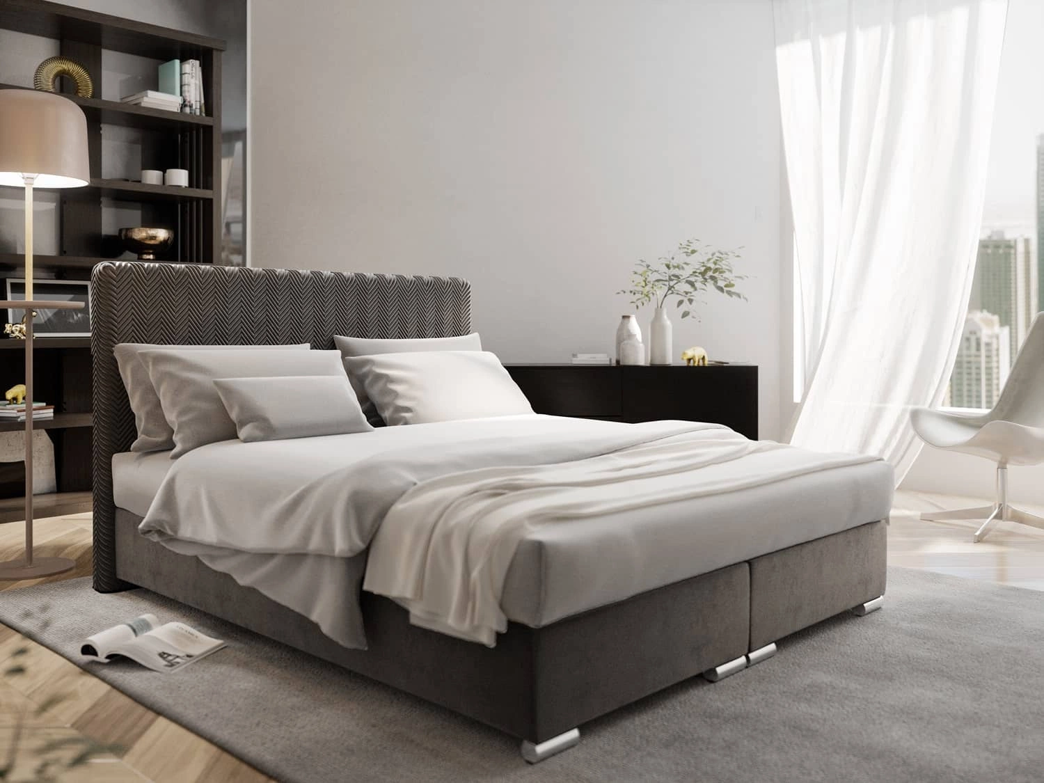 Das Bett aus dem Stoff Riviera 91 garantiert höchsten Komfort und Funktionalität für die tägliche Entspannung im Schlafzimmer. Der Stoff ist sehr weich und angenehm anzufassen. Das verwendete Gewebe ist sehr abrieb- und reibungsfest sowie lichtecht. Dank der Eigenschaften des verwendeten Stoffes behält das kontinentale Bett lange Zeit sein ursprüngliches Aussehen. Das Design des Bettes bietet große Stabilität und Komfort bei der Benutzung. Der Rahmen des kontinentalen Bettes ist aus Holz und einer Möbelplatte gefertigt. Pzurrgurte am Kopfteil sind ein Blickfang und verleihen dem Bett einen besonderen Charakter.