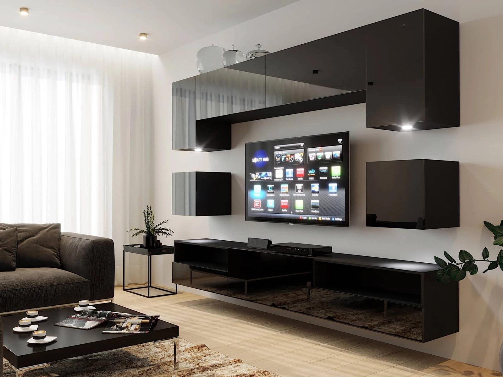 Siana schwarz / schwarz glänzend äußerst stilvolle Schrankwand für das Wohnzimmer optisch ansprechend und funktional