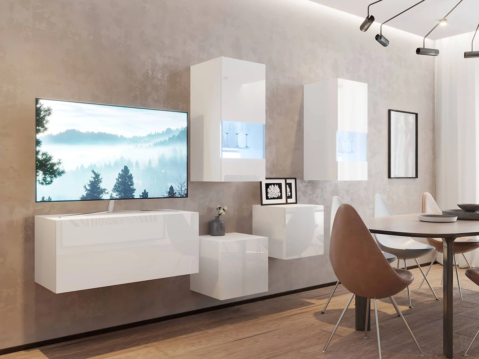 Hängeelement Termo weiß / weiß glänzend Trendige und stilvolle Wohnwand mit grifflosem Push-to-Open-Türsystem