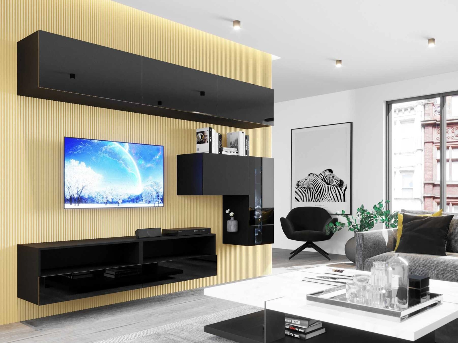 Patras schwarz / schwarz glänzend Schrankwand modisch und stilvoll geometrisch gestaltet Schrankwand einfache Formen der Möbelstücke