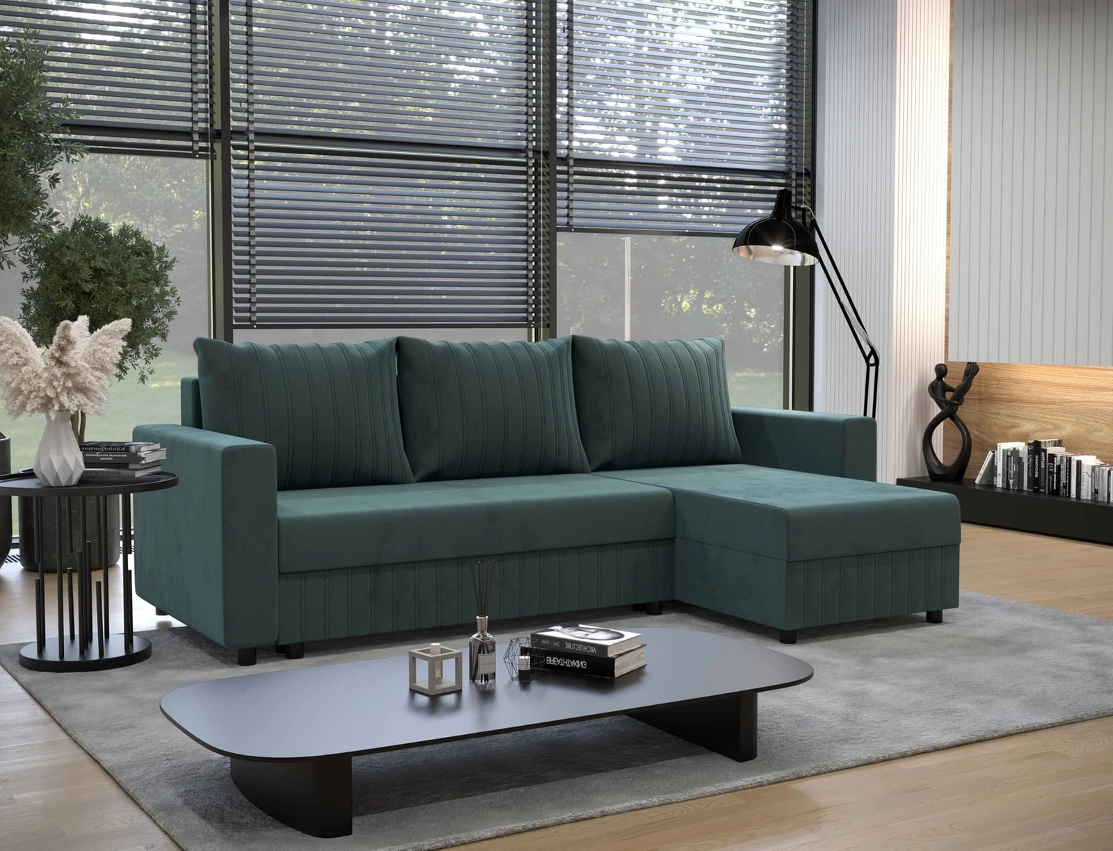 Ecksofa mit Schlaffunktion Pasco grün rechte Ecke Klassisches Ecksofa, das in jede Einrichtung passt Ziernähte