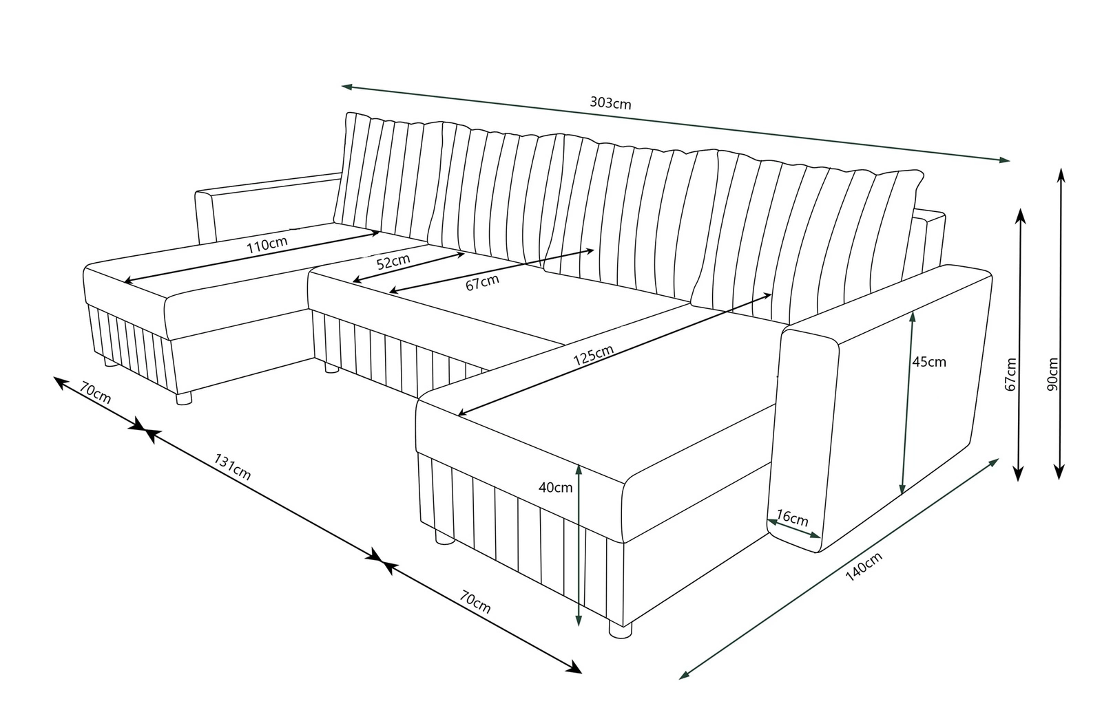 Die Abmessungen der Möbel ermöglichen platz in einem geräumigen Wohnzimmer oder Sitzungssaal zu schaffen. Breite der Ecke 303 cm, höhe 90 cm und Tiefe 140 cm. Die Liegefläche der Eckeinheit beträgt 125x271 cm. Die Sitzhöhe des Möbels beträgt 40 cm und die maximale Höhe der Rückenlehne beträgt 50 cm. Gewellte Federn und T30-Polyurethanschaum ist das Material, aus dem der Sitz der Ecke gefertigt ist. Rückenlehne kissen garantiert komfortable Entspannung nach einem langen Tag, die Sie und Ihre Gäste auf diesem einzigartigen Ecksofa schätzen werden.