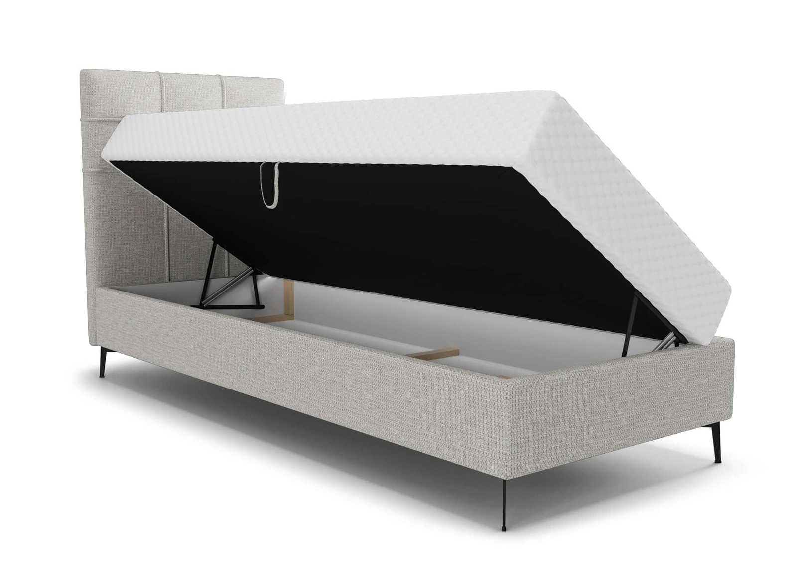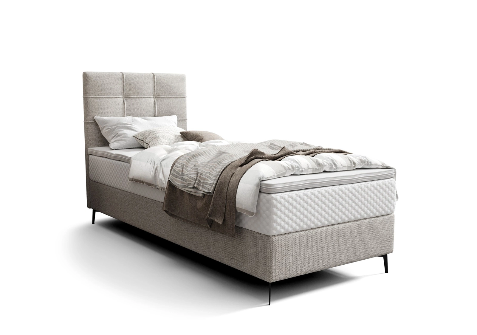 - Das kontinentale Bett Irvine ist die perfekte Wahl für ein kleineres Schlafzimmer oder ein Jugendzimmer. Hohe Kopfstütze mit stilvollem Finish schmückt den Innenraum. Schwarze Metallbeine und Polsterstoffe mit interessanter Struktur vervollständigen das G