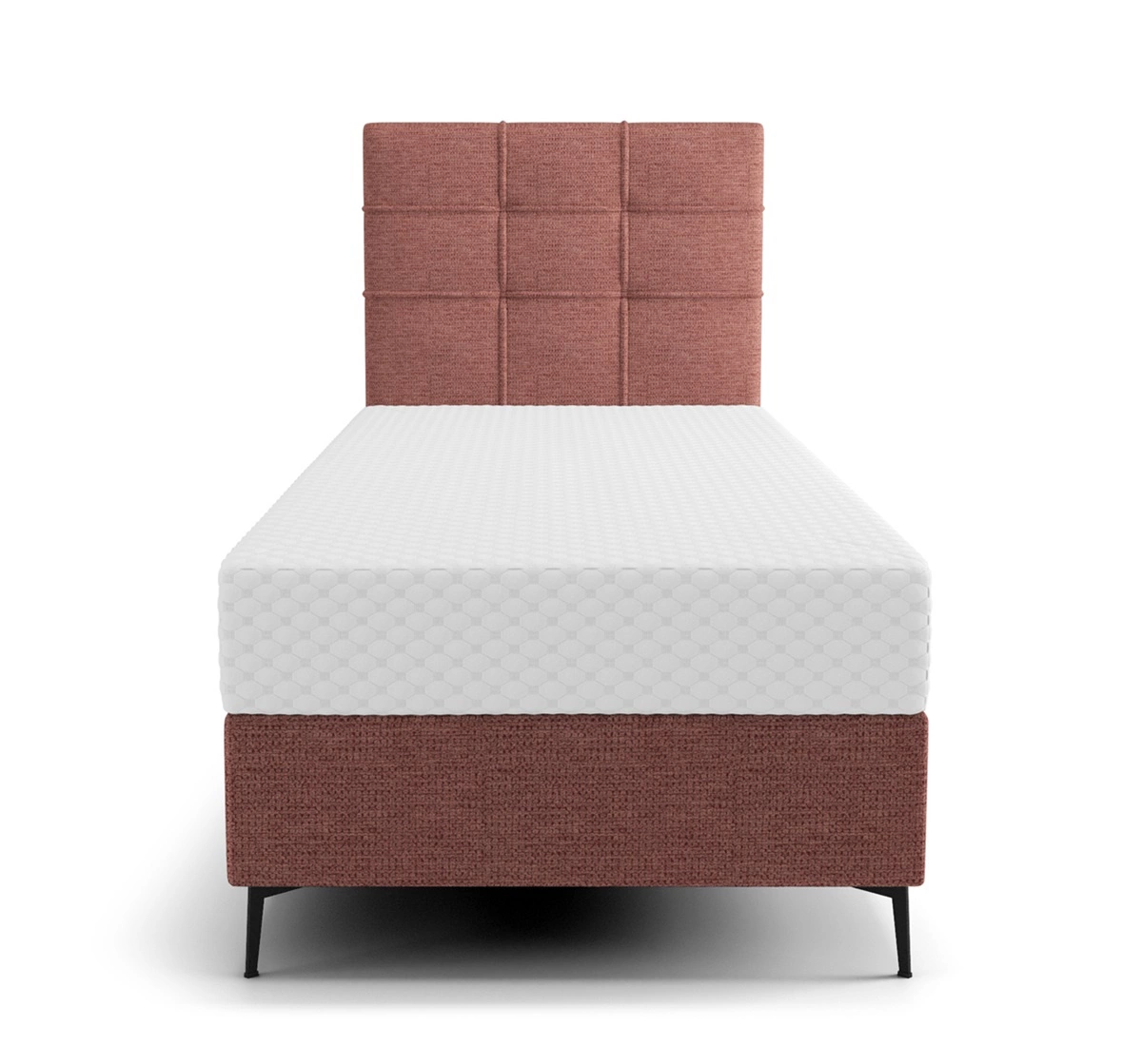 • Das kontinentale Bett Irvine ist die perfekte Wahl für ein kleineres Schlafzimmer oder ein Jugendzimmer. Hohe Kopfstütze mit stilvollem Finish schmückt den Innenraum. Schwarze Metallbeine und Polsterstoffe mit interessanter Struktur vervollständigen das G