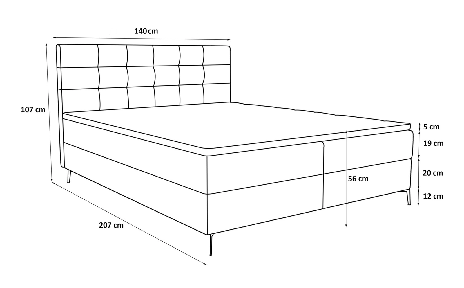 Das kontinentale Bett Irvine ist eine Kombination aus Funktionalität und modernem Design, die jedes Schlafzimmer mit Eleganz und Stil bereichert. Hohe Kopfstütze mit Designoberfläche schmückt nicht nur den Innenraum, sondern dient auch als bequeme Ablage, wenn man ein Buch liest, fernsieht oder am Laptop arbeitet. Die Struktur des Bettes 140x200 stützt sich auf hoch, metallbeine in Schwarz, die die Modernität unterstreichen und die Stabilität der Möbel garantieren. Die stilvollen Kontinentalbetten aus der Irvine-Kollektion schaffen einen äußerst komfortablen und bequemen Raum für die tägliche Entspannung.