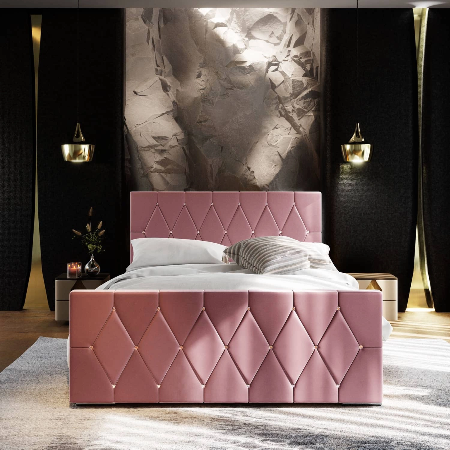 Polsterbett Tifton 160x200 puderrosa mit Stauraum im modernen Stil mit markantem Kopf- und Fußteil mit Kristallen veredelt