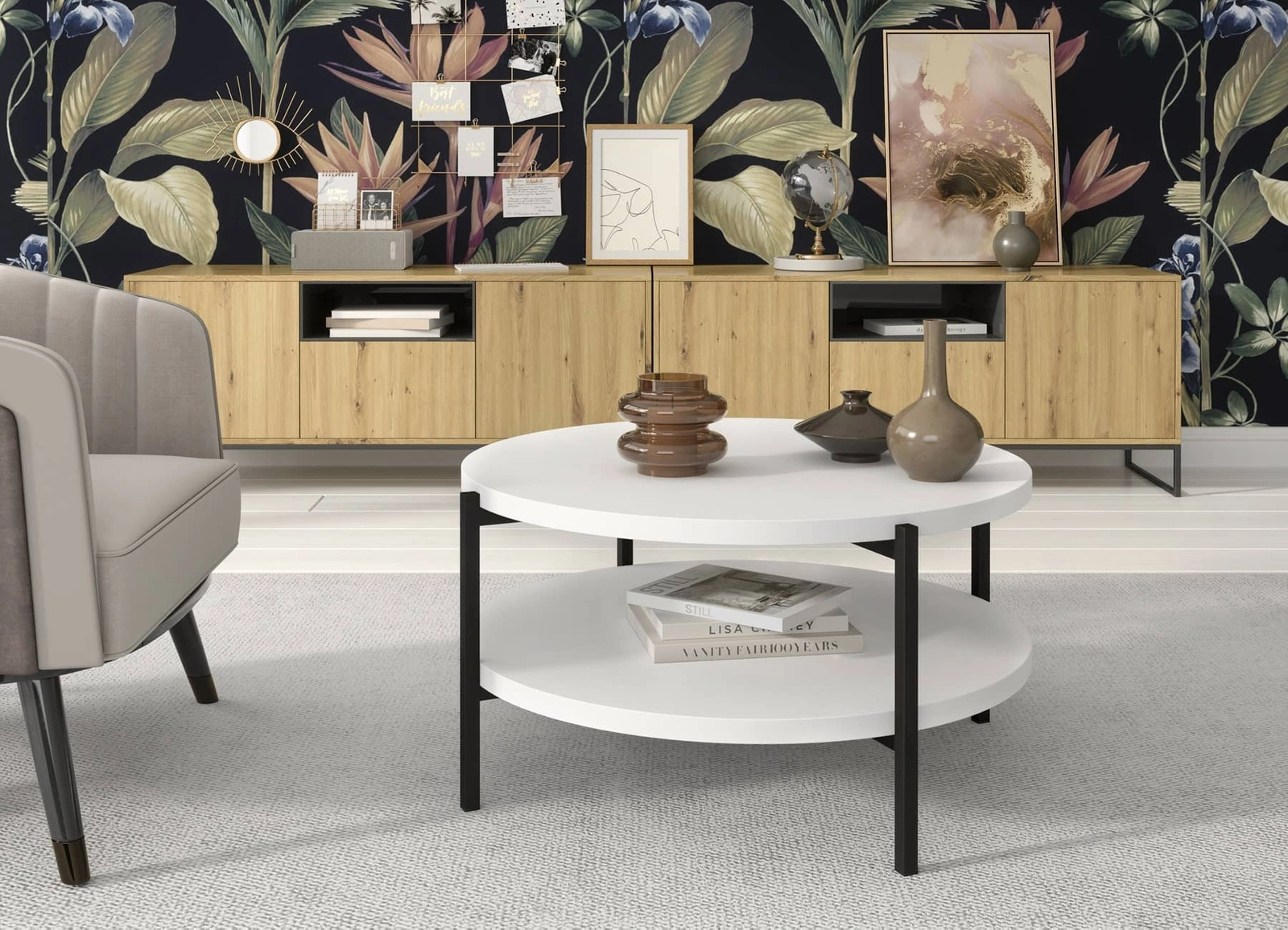 Runder Couchtisch 84 cm Sampi weiß mit zusätzlicher Ablage helles Design solides Metallgestell idealer Tisch für jede Einrichtung