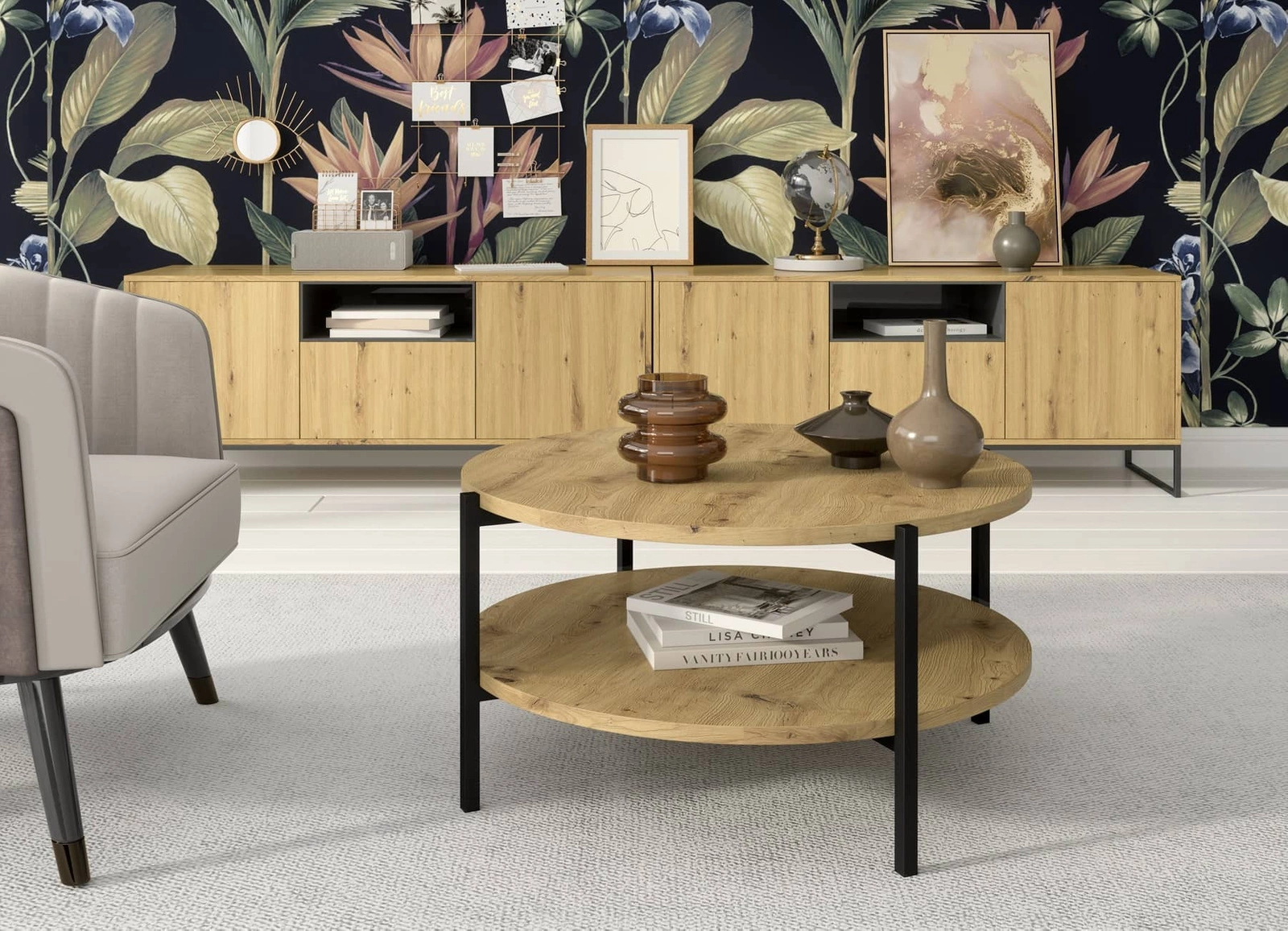 Runder Couchtisch 84 cm Sampi Eiche artisan mit zusätzlicher Ablagefläche leichtes Design Metallgestell idealer Tisch für jede Einrichtung