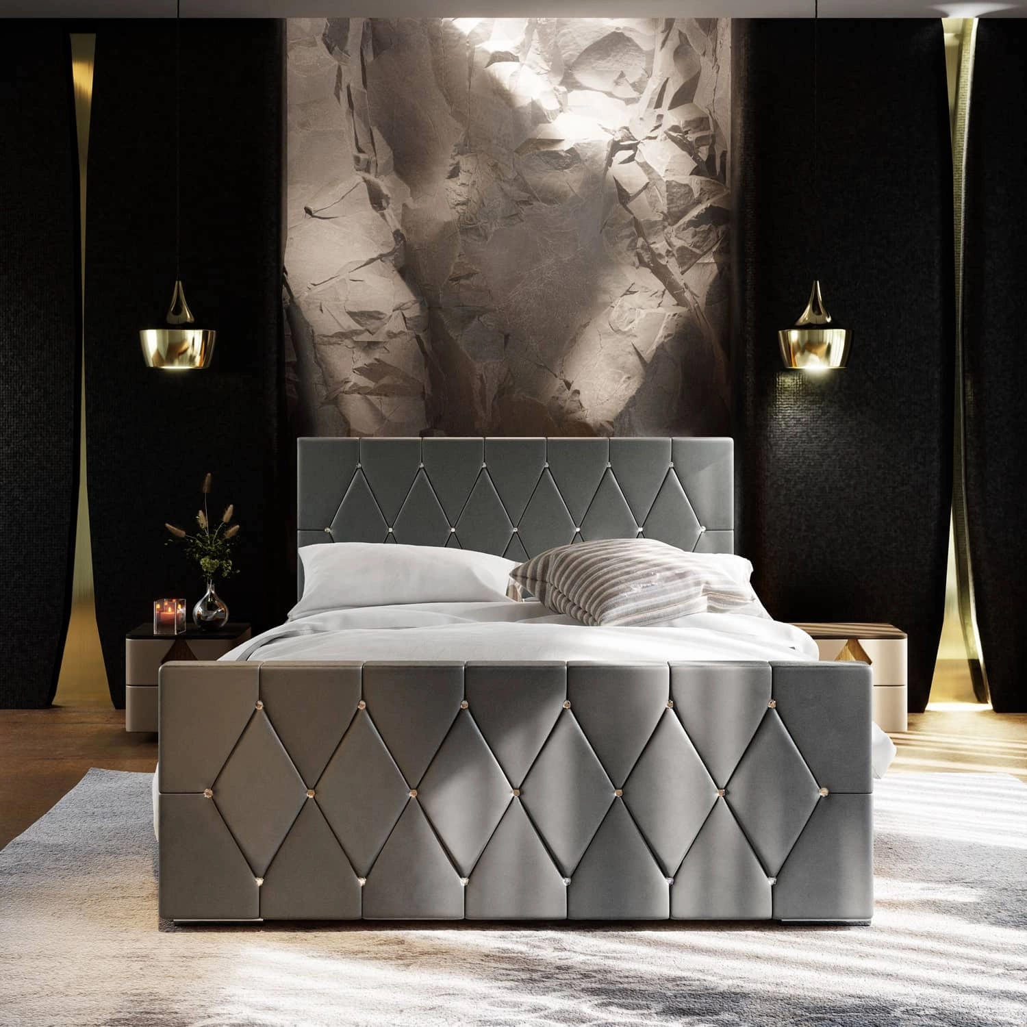 Polsterbett Tifton 180x200 hellgrau mit Stauraum im modernen Stil mit markantem Kopf- und Fußteil mit Kristallen veredelt