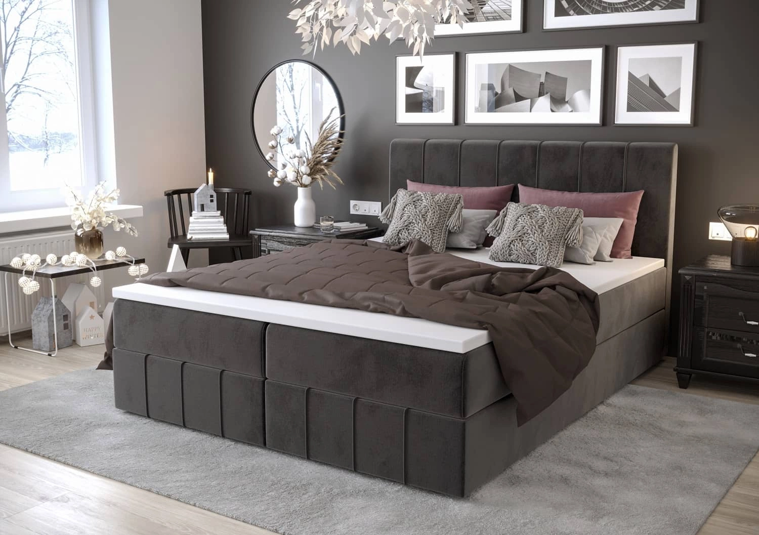 Bett aus Stoff typ samt Monolith 92 garantiert ein Höchstmaß an Komfort und Funktionalität für die tägliche Entspannung im Schlafzimmer. Der Stoff hat eine Beschichtung aus hydrophob, was eine begrenzte Flüssigkeitsaufnahme gewährleistet. Die interessante Struktur des Gewebes verleiht einen einzigartigen Charakter. Dank der Eigenschaften des verwendeten Stoffes behält das kontinentale Bett lange Zeit sein ursprüngliches Aussehen. Das Design des Bettes bietet große Stabilität und Komfort bei der Benutzung. Der Rahmen des kontinentalen Bettes ist aus Holz und einer Möbelplatte gefertigt. Vertikal nähte am Kopfteil sind ein Blickfang und verleihen dem Bett einen besonderen Charakter.