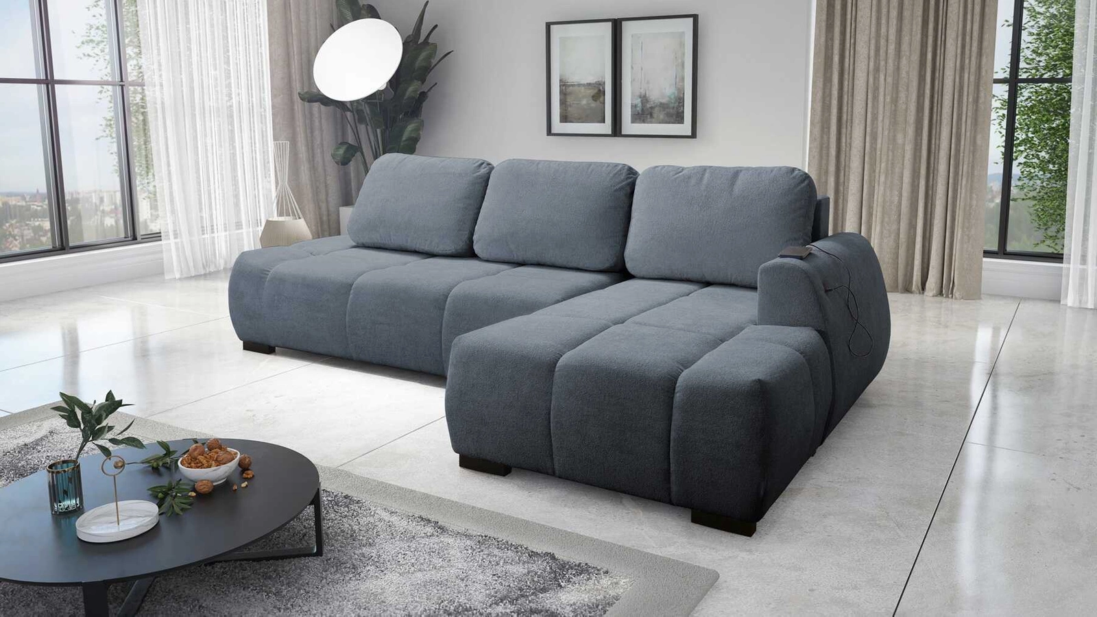 Die Extras dieses Möbelstücks, die alle Nutzer schätzen werden, sind der Bettzeugbehälter und die USB-Ladebuchse an der Seite des Eckmöbels.