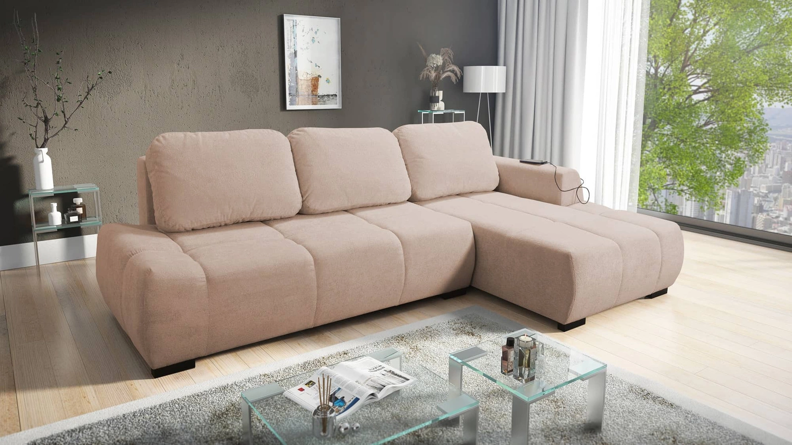 Die Extras dieses Möbelstücks, die alle Nutzer schätzen werden, sind der Bettzeugbehälter und die USB-Ladebuchse an der Seite des Eckmöbels.