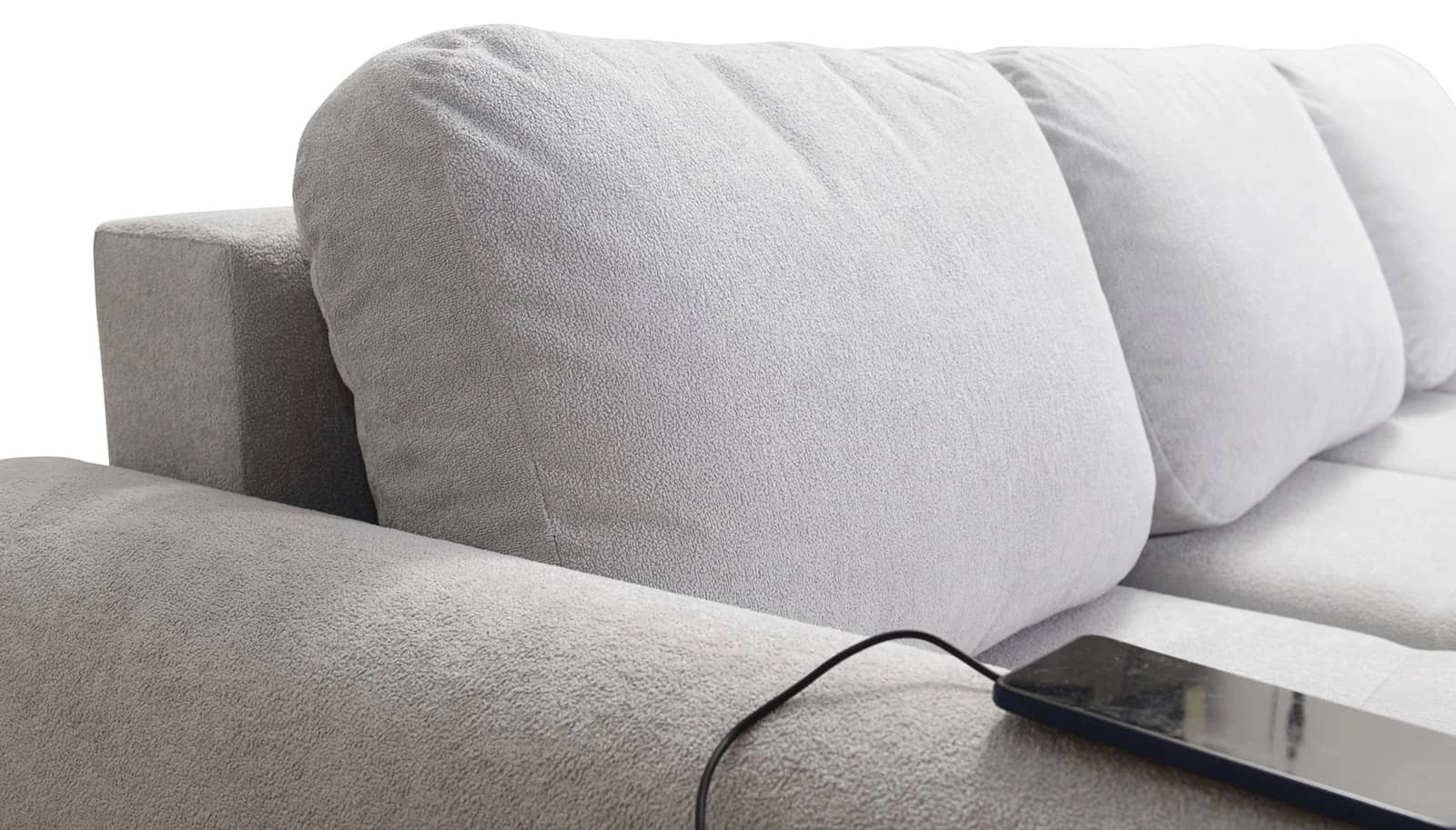 Die Extras dieses Möbelstücks, die alle Nutzer schätzen werden, sind der Bettzeugbehälter und die USB-Ladebuchse an der Seite des Eckmöbels.