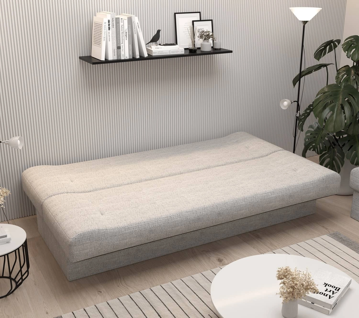 Das Aufklappen des Sofas ist sehr einfach und erfordert keinen großen Kraftaufwand. Das alles dank des Klick-Klack-Mechanismus, der sich durch seine einfache Konstruktion und lange Lebensdauer auszeichnet. Polyurethan-Schaumstoff T30 sind die Materialien des Sofasitzes. Die Liegefläche des Sofas beträgt 112x192 cm. Ein Vorschlag für diejenigen, die ihren Schlafkomfort verbessern wollen, ist eine Matratzenauflage. Die zusätzliche Polsterung gleicht alle Unebenheiten des Sofas aus, die durch die Konstruktion des Möbels entstehen. Die Rückseite des Sofas ist mit einem Ersatzstoff gepolstert, um das Möbelstück angemessen zu schützen.
