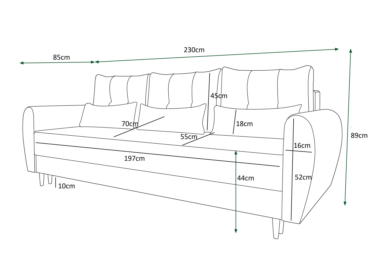 Dank seiner optimalen Abmessungen und seiner breiten Funktionalität eignet sich das Sofa Rovigo ideal als Sofa für das Wohnzimmer oder als Sofa für den Wohnbereich. Das Sofa ist perfekt für bekommen auch als Sofa für das Arbeitszimmer oder als Sofa für das Büro. Sofas der 3-Personen-Rovigo passt perfekt in jede Einrichtung in Ihrem Lieblingsstil! Gepolsterte Rückenlehne sofas ermöglicht die Aufstellung der Möbel in jedem Teil des Raumes. Breite des Sofas 230 cm, höhe 89 cm und Tiefe 85 cm. Die Liegefläche des Sofas beträgt 130x196 cm. Die Sitzhöhe des Möbels beträgt 44 cm, die Höhe der Rückenlehne beträgt 45 cm. Gewellte Federn und T30-Polyurethanschaum ist das Material, aus dem die Sitzfläche des Sofas hergestellt ist. Rückenlehne kissen garantiert eine bequeme Erholung nach einem langen Tag, die Sie und Ihre Gäste auf diesem einzigartigen Sofa schätzen werden!