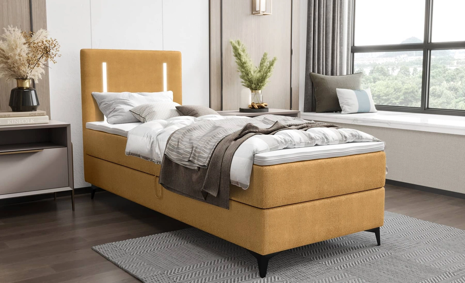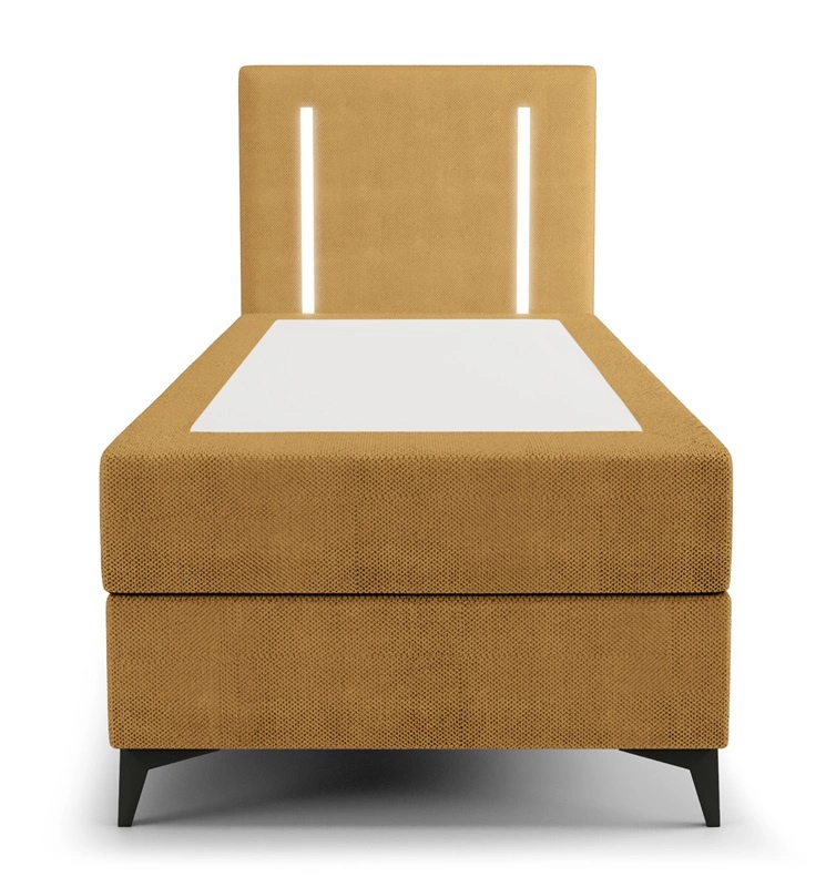 Boxspringbett Norco 90x200 gelb stilvolles Bett mit Bettzeug Lagerung Beleuchtung im Kopfteil fügt eine einzigartige Note