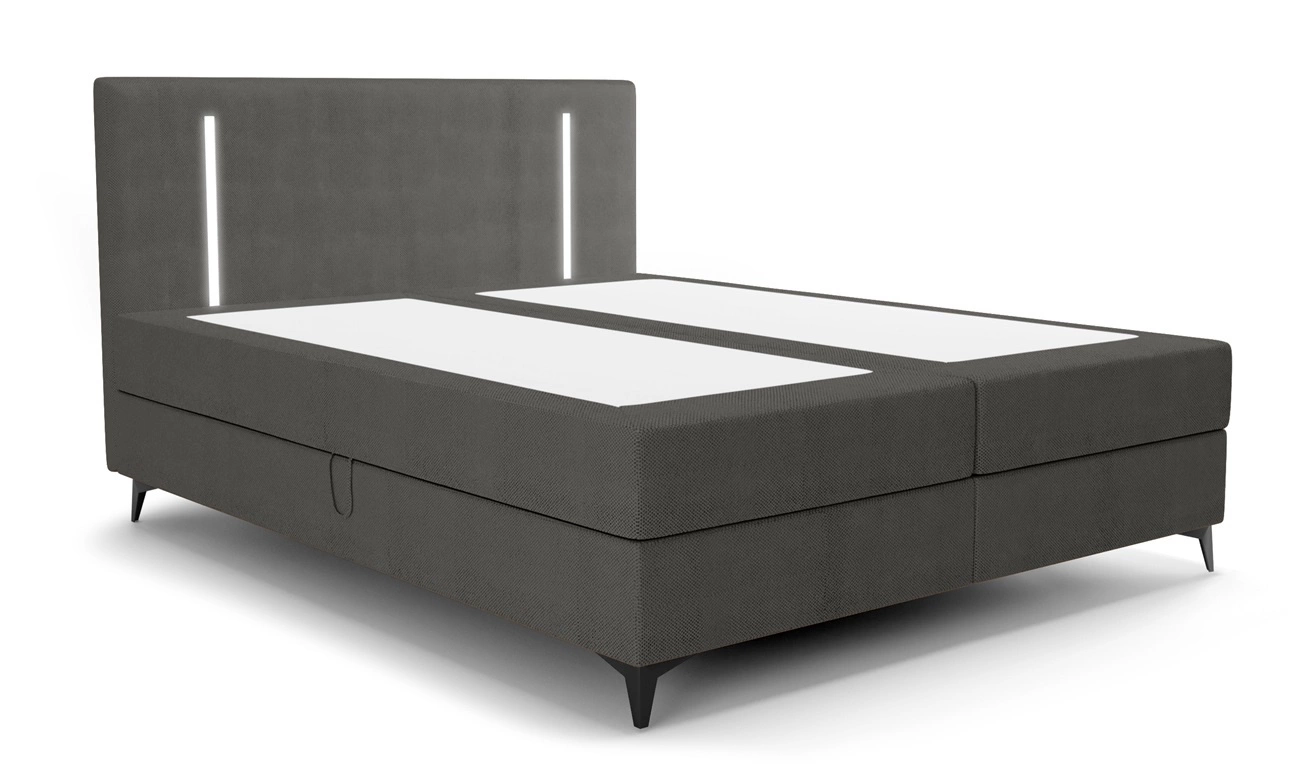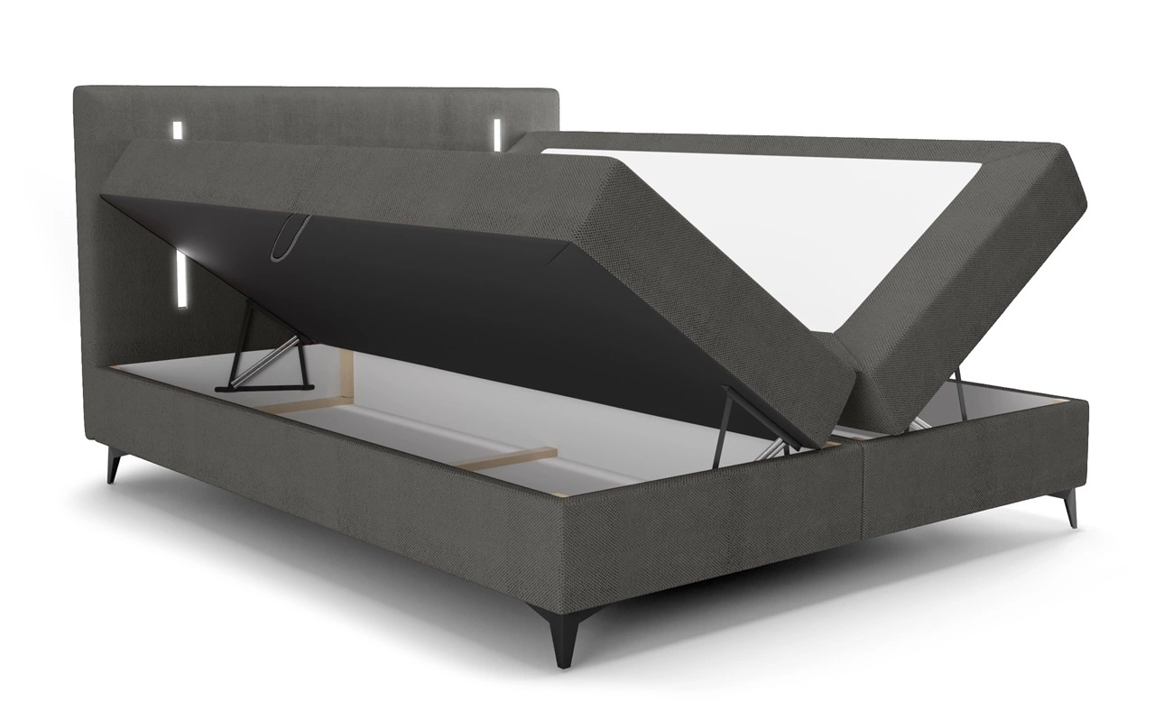 Für mehr Funktionalität das kontinentale Bett ist ausgestattet mit zwei Behälter, die eine bequeme Lagerung ermöglichen notwendiges Zubehör. Der Zugang zu den Bettkästen erfolgt durch Anheben der Matratze. Zuverlässige automatische Hebehilfen erleichtern die Arbeit.