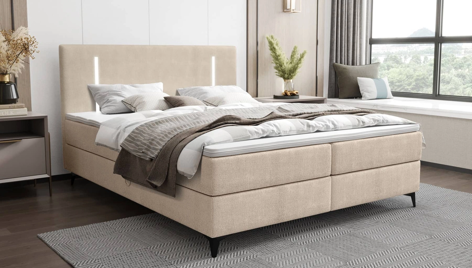 Boxspringbett Norco 180x200 beige stilvolles Bett mit einem Staufach Beleuchtung im Kopfteil fügt eine einzigartige Note