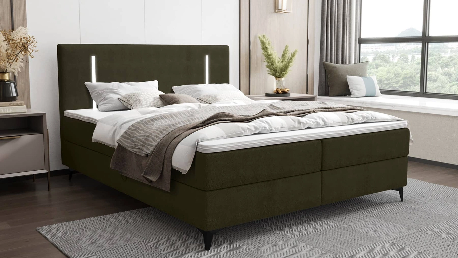 Boxspringbett Norco 180x200 grün stilvolles Bett mit Aufbewahrungsbox Beleuchtung im Kopfteil fügt eine einzigartige Note